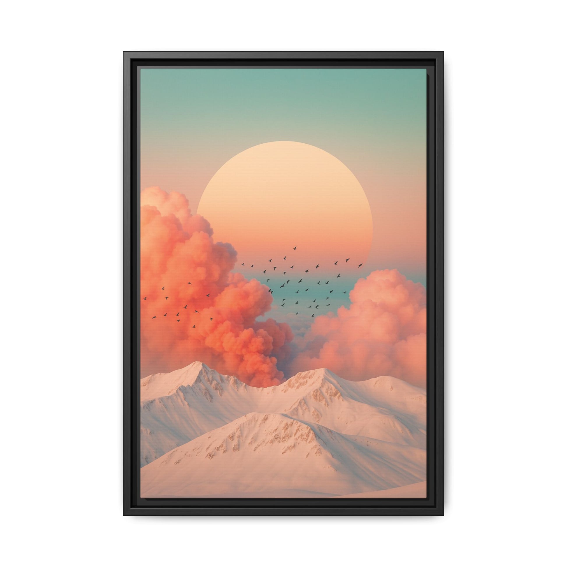 A dreamy landscape of snow-covered mountains and vibrant peach clouds backlit by a massive pastel sun. Birds fly into the horizon, giving motion to an otherwise still world. Ethereal and soothing—this image feels like a moment suspended in time.