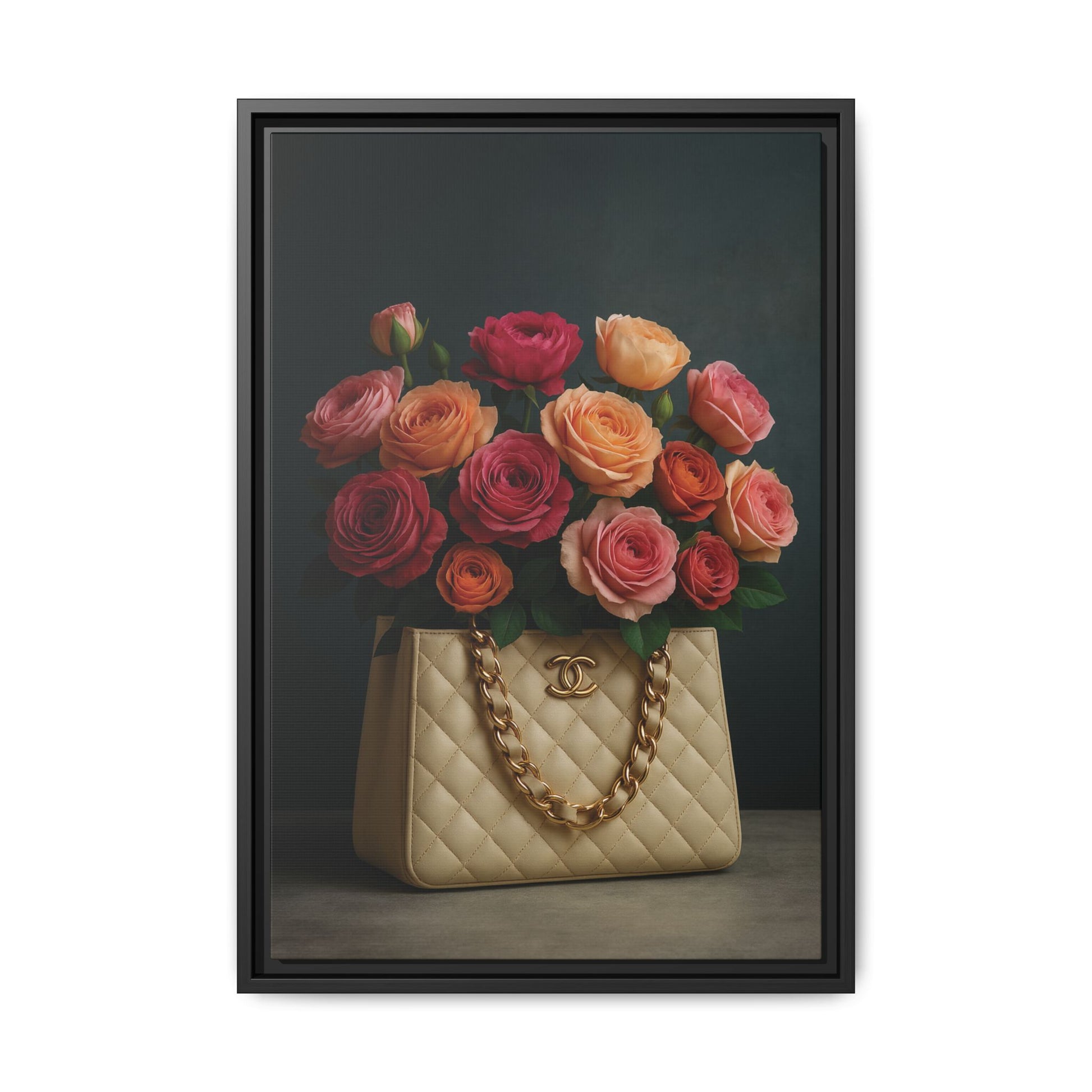 Chic Bloom blends timeless fashion with floral elegance—a cream quilted designer handbag overflows with radiant roses in rich pinks, peaches, and corals. The soft texture of the bag, paired with a gold chain and iconic emblem, contrasts beautifully against the moody backdrop. Sophisticated and feminine, this canvas captures luxury reimagined as art.