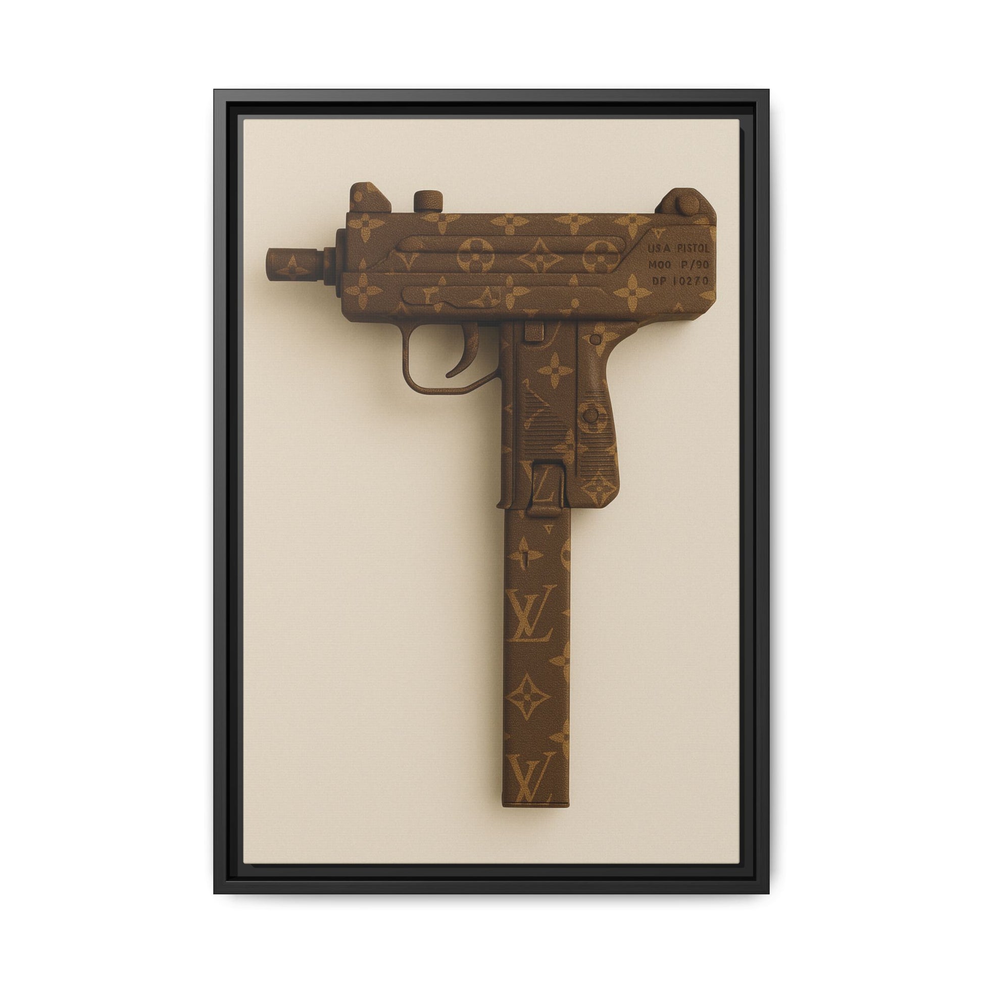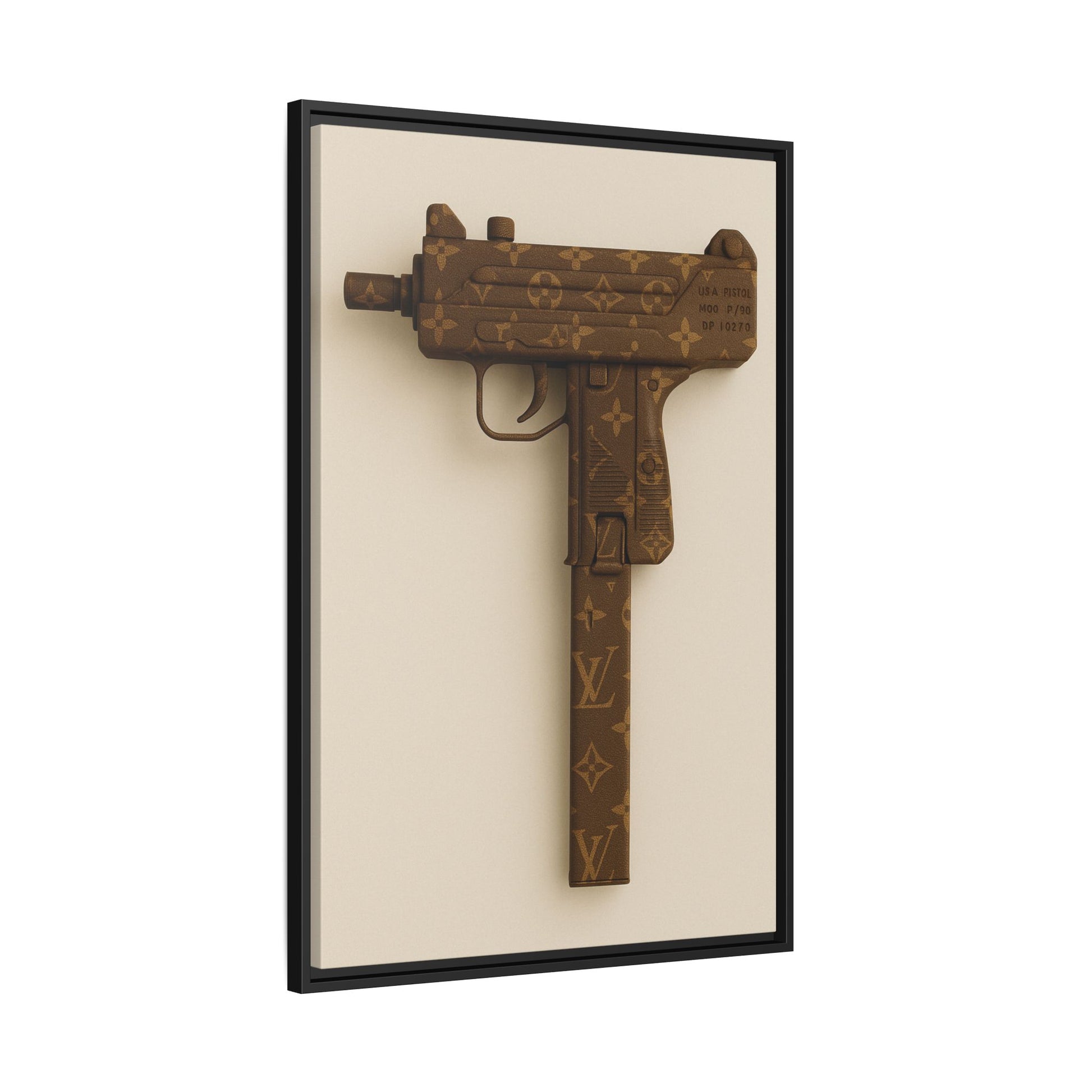 “Loaded Luxury” is a striking visual juxtaposition that redefines opulence with an edge. This designer-wrapped pistol, sheathed in iconic monogram leather and rendered in rich brown and gold tones, elevates an instrument of force into a symbol of elite rebellion. Clean lines and meticulous detailing give it a polished presence, while the subject matter hints at power, exclusivity, and danger dressed in couture.
