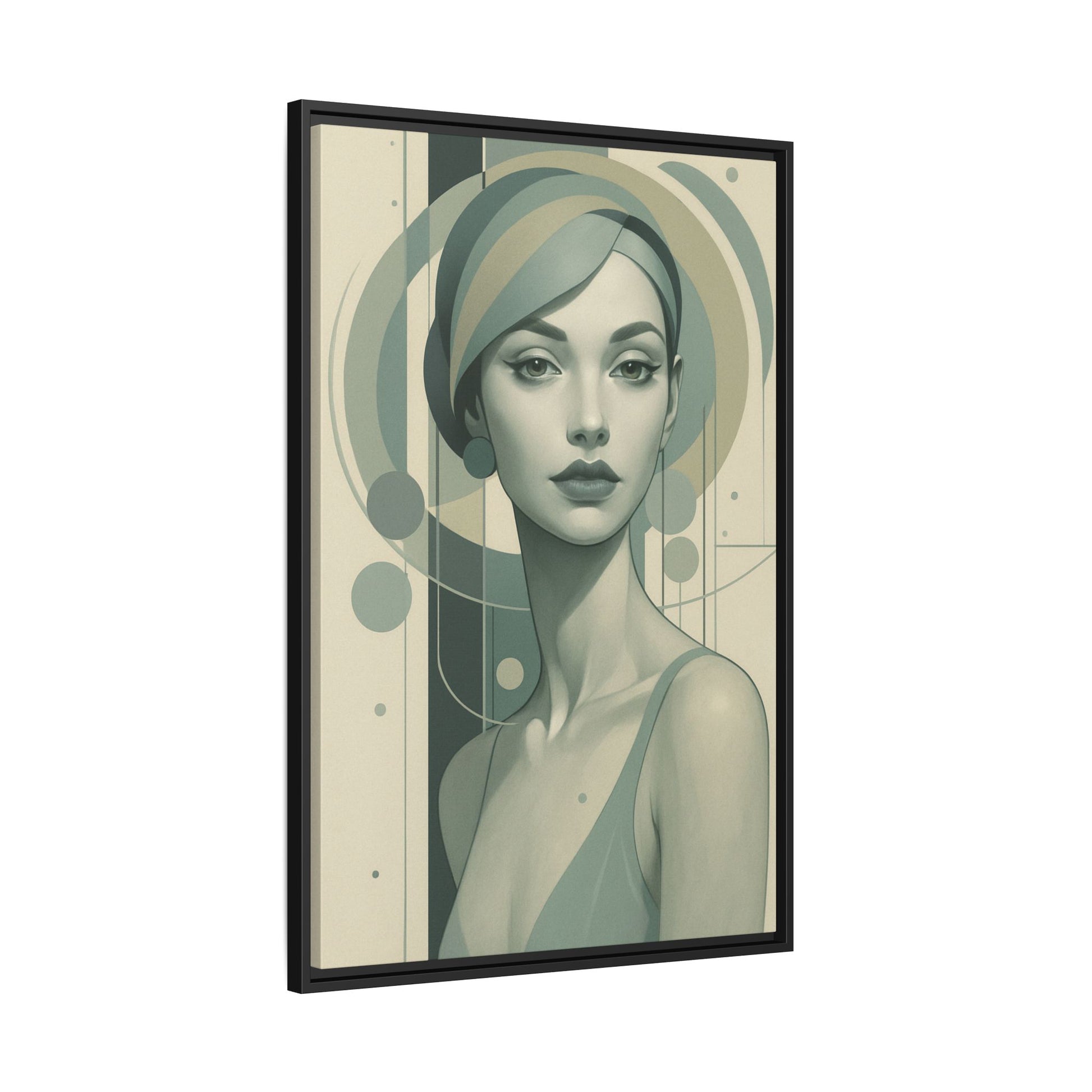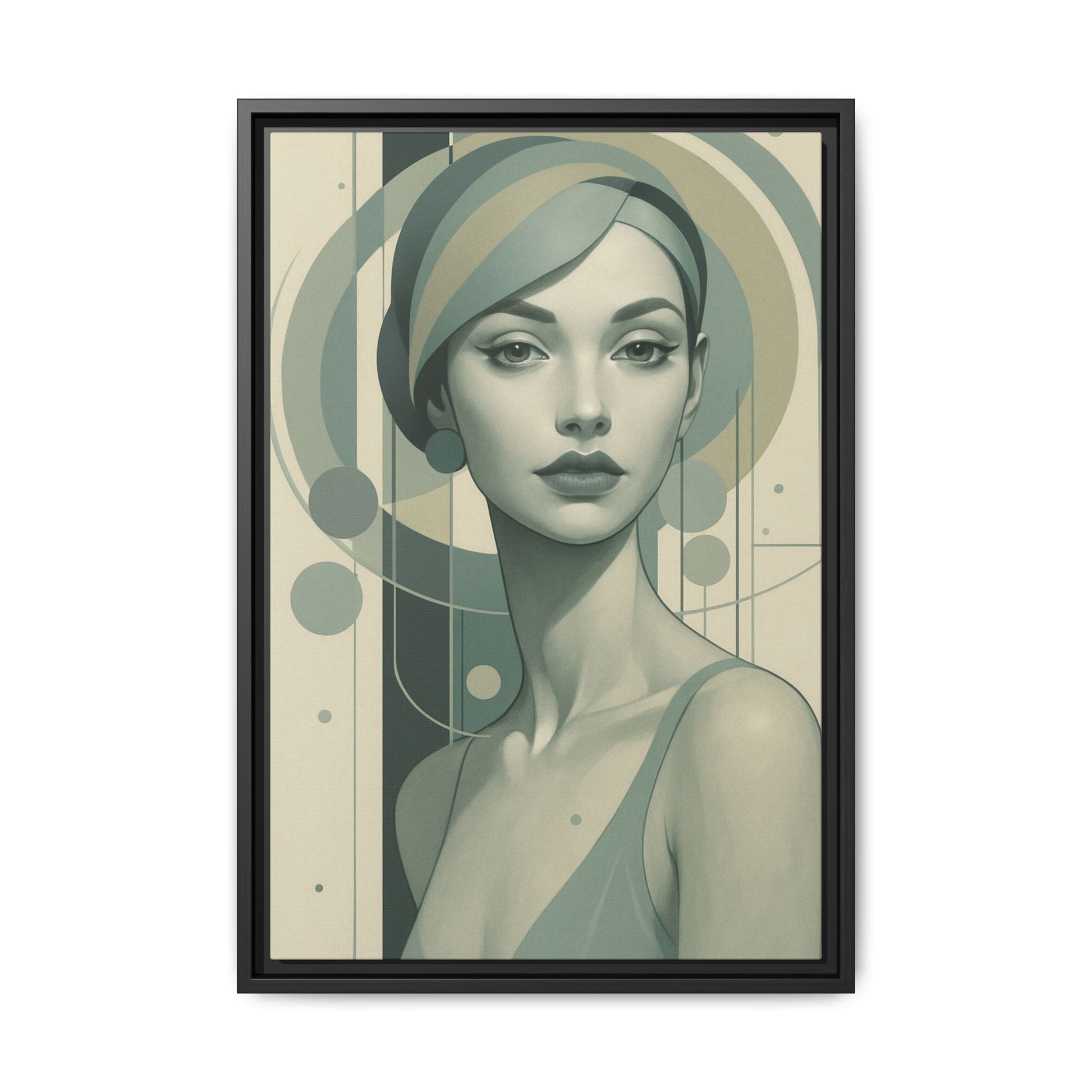 “Muse in Motion” captures timeless elegance through a lens of modern geometry and soft tonal harmony. The portrait of a poised, graceful woman is framed by sweeping arcs, circles, and vertical lines in a muted palette of teals and neutrals. Her confident gaze and minimalist beauty evoke a sense of calm strength, while the abstract background adds rhythm and sophistication—blending classic femininity with Art Deco and contemporary design.
