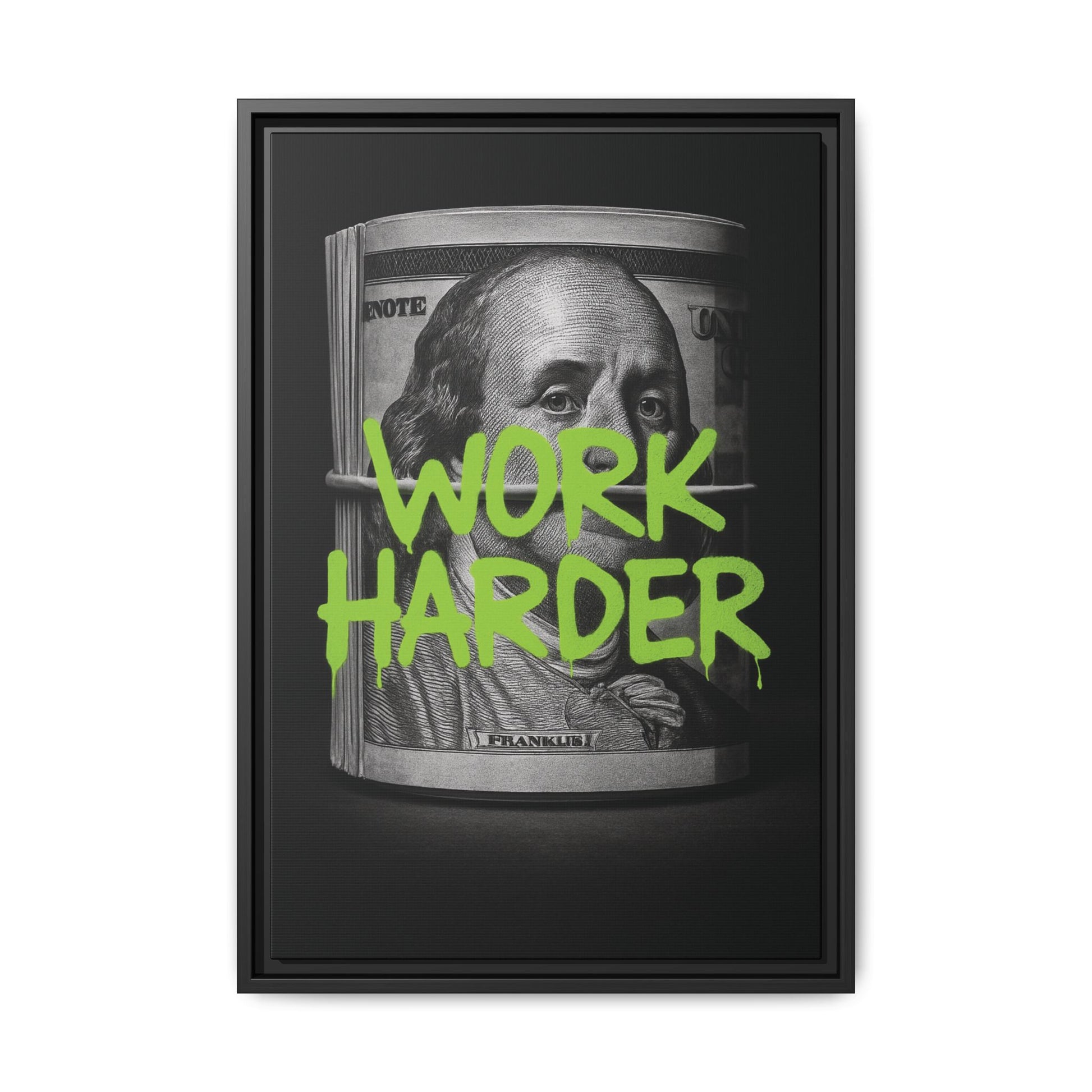 Work Harder is a bold visual mantra that fuses hustle culture with pop-art provocation. A tightly rolled stack of hundred-dollar bills becomes the canvas for bright green graffiti scrawled across Benjamin Franklin’s gaze, urging relentless ambition with unapologetic urgency. Gritty, graphic, and motivational, this piece is a streetwise salute to grind mentality and the raw pursuit of success—perfect for high-energy workspaces and unapologetic dreamers.