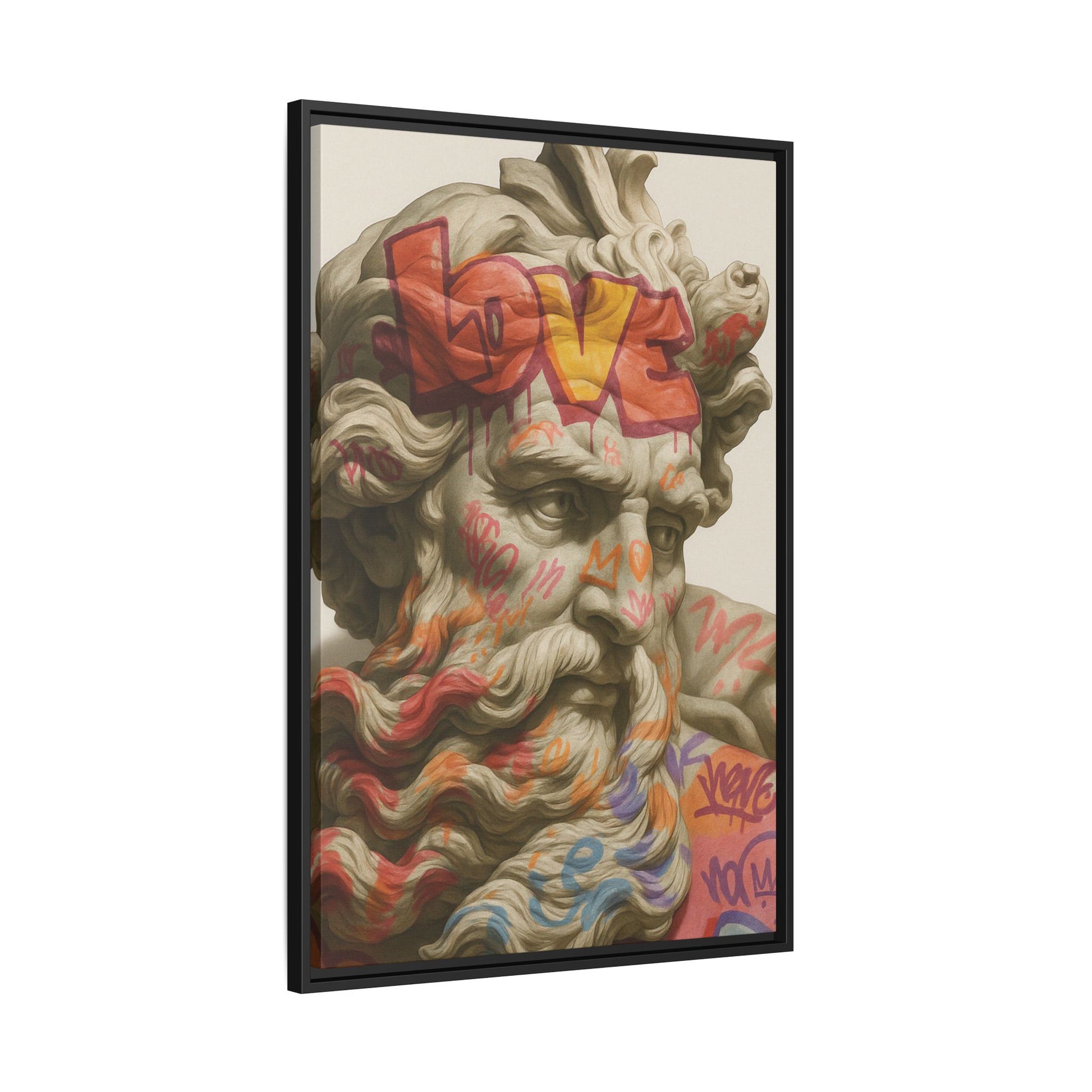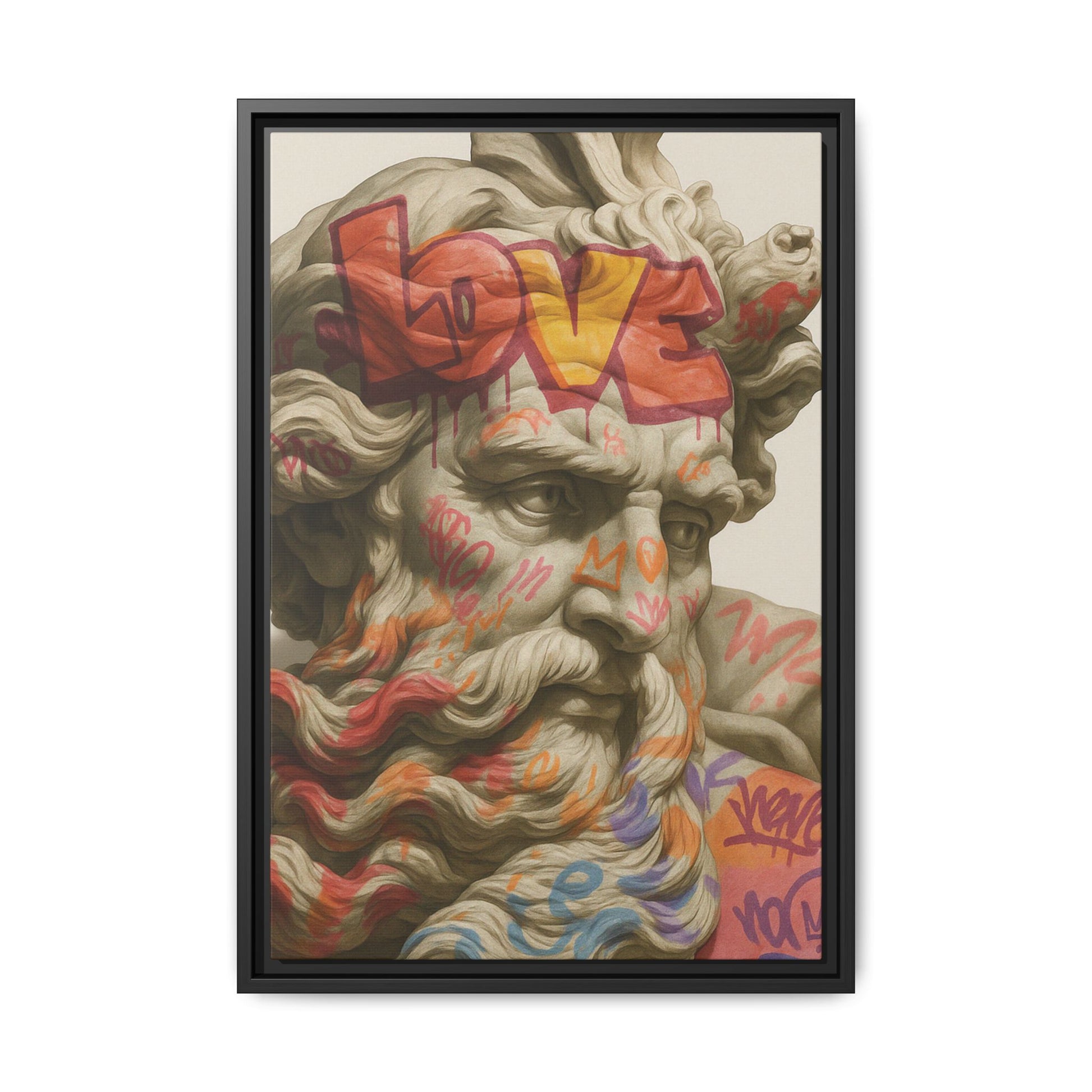 “Divine Vandal” is a rebellious fusion of antiquity and street culture — a classical marble bust overtaken by vibrant graffiti tags and bold spray-painted words like LOVE and COPE. The once-stoic figure is reimagined as a living canvas, embodying the tension between permanence and impermanence, tradition and disruption. The result is both irreverent and iconic, a celebration of creative defiance and the enduring power of self-expression.