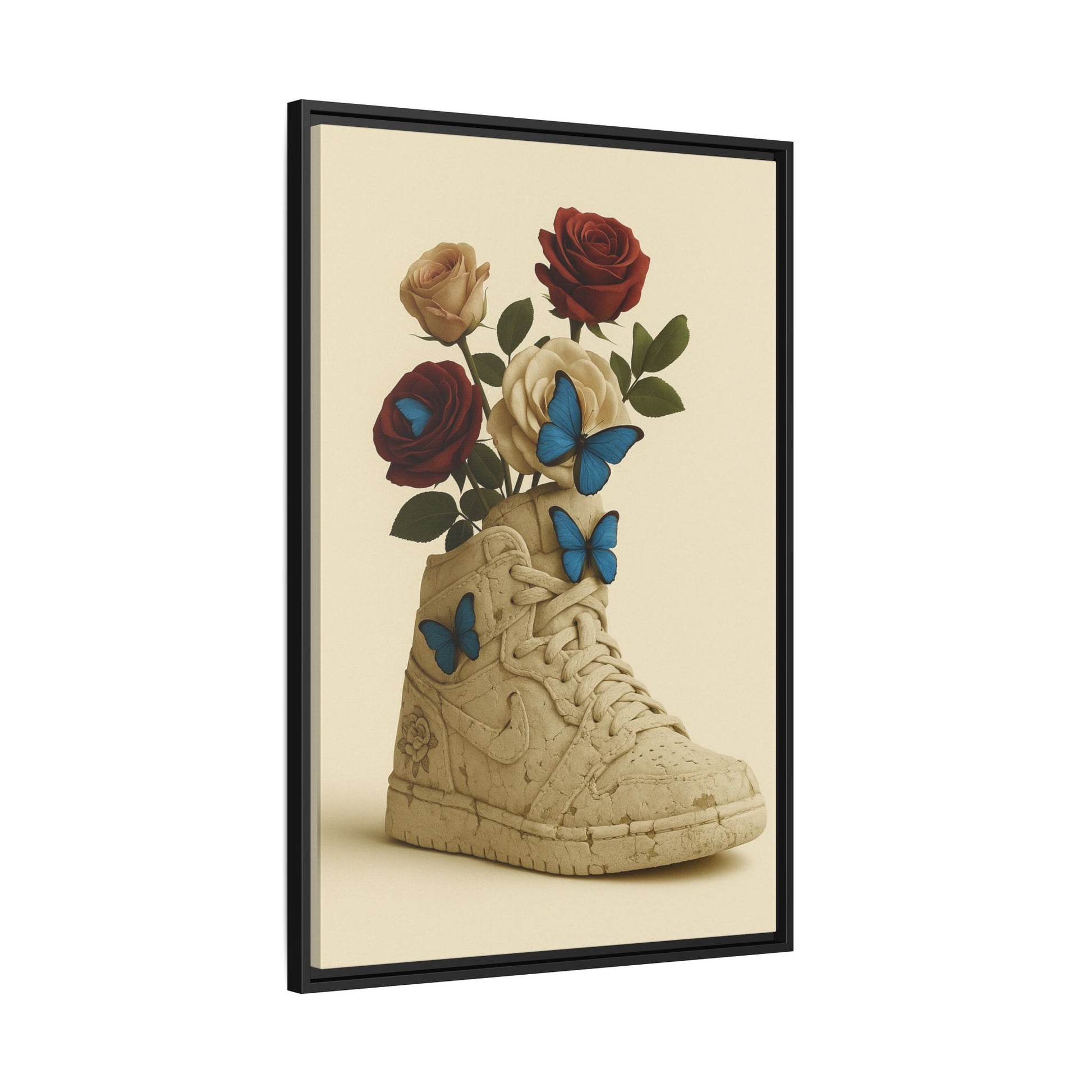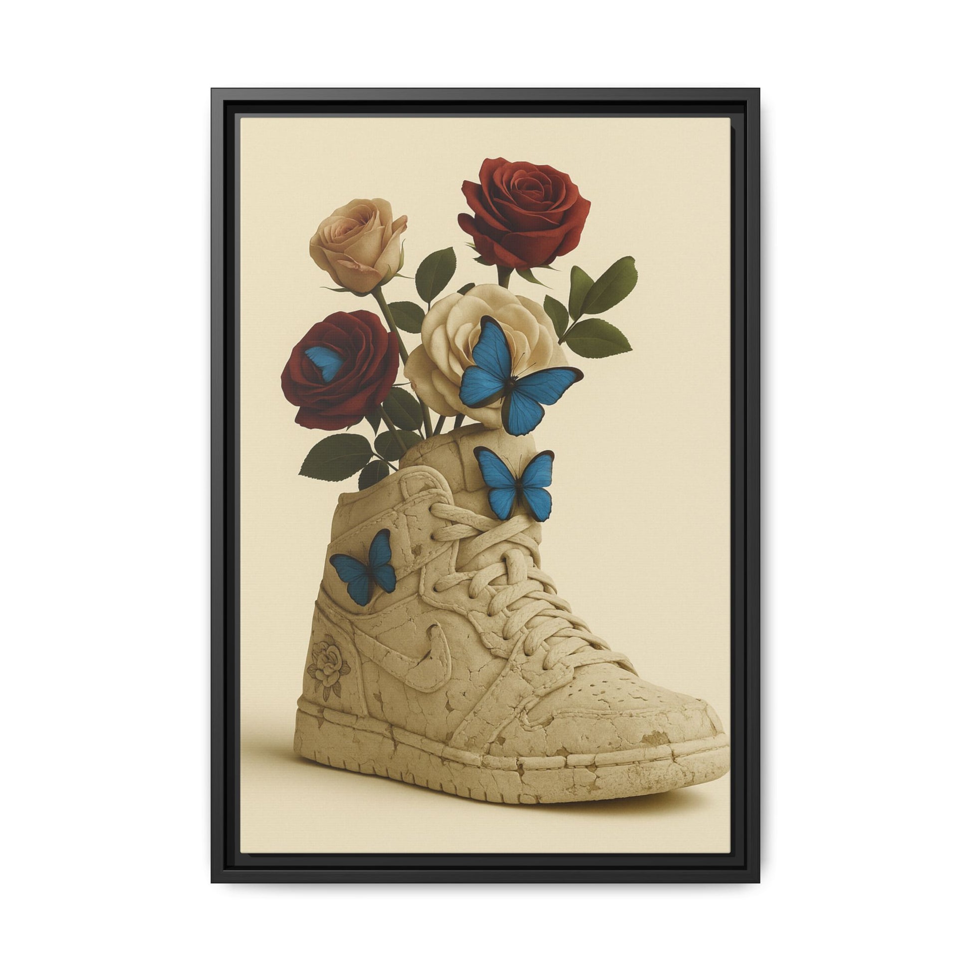 “Bloom in Motion” is a poetic fusion of street culture and natural beauty, depicting a weathered stone sneaker transformed into a blooming vessel. Vibrant red and cream roses emerge from the high-top silhouette, while luminous blue butterflies dance delicately around the petals and laces. The cracked texture of the sneaker contrasts with the soft elegance of flora and fauna, symbolizing resilience, rebirth, and the unexpected harmony between grit and grace.
