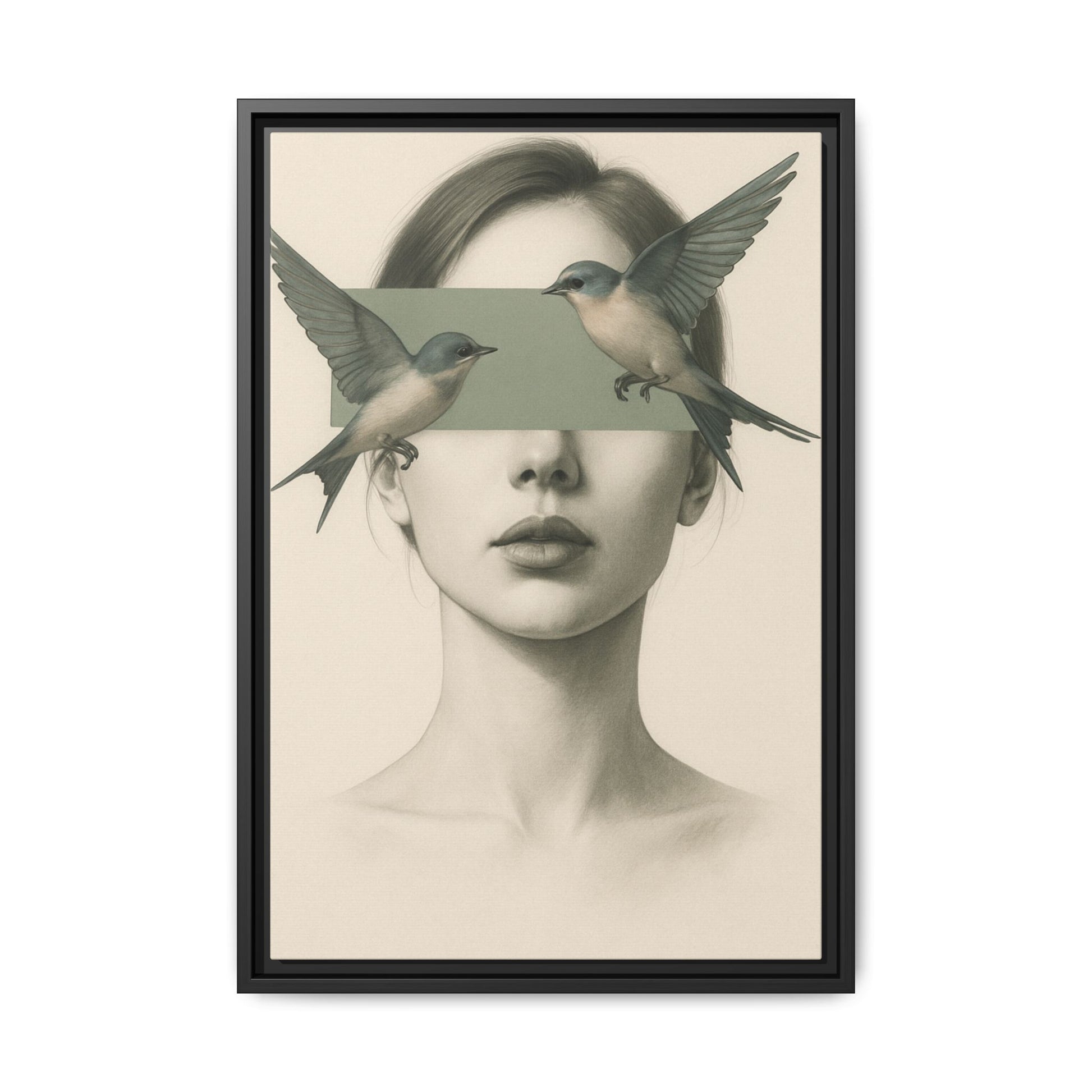 “Sight Unseen” is a minimalist surrealist portrait that explores the tension between vision, emotion, and the freedom of thought. A serene, graphite-rendered woman is partially obscured by a soft green band across her eyes, from which two delicate swallows emerge—frozen in flight as if carrying her perception outward. The composition speaks to introspection, liberation, and the unseen forces that guide us from within.