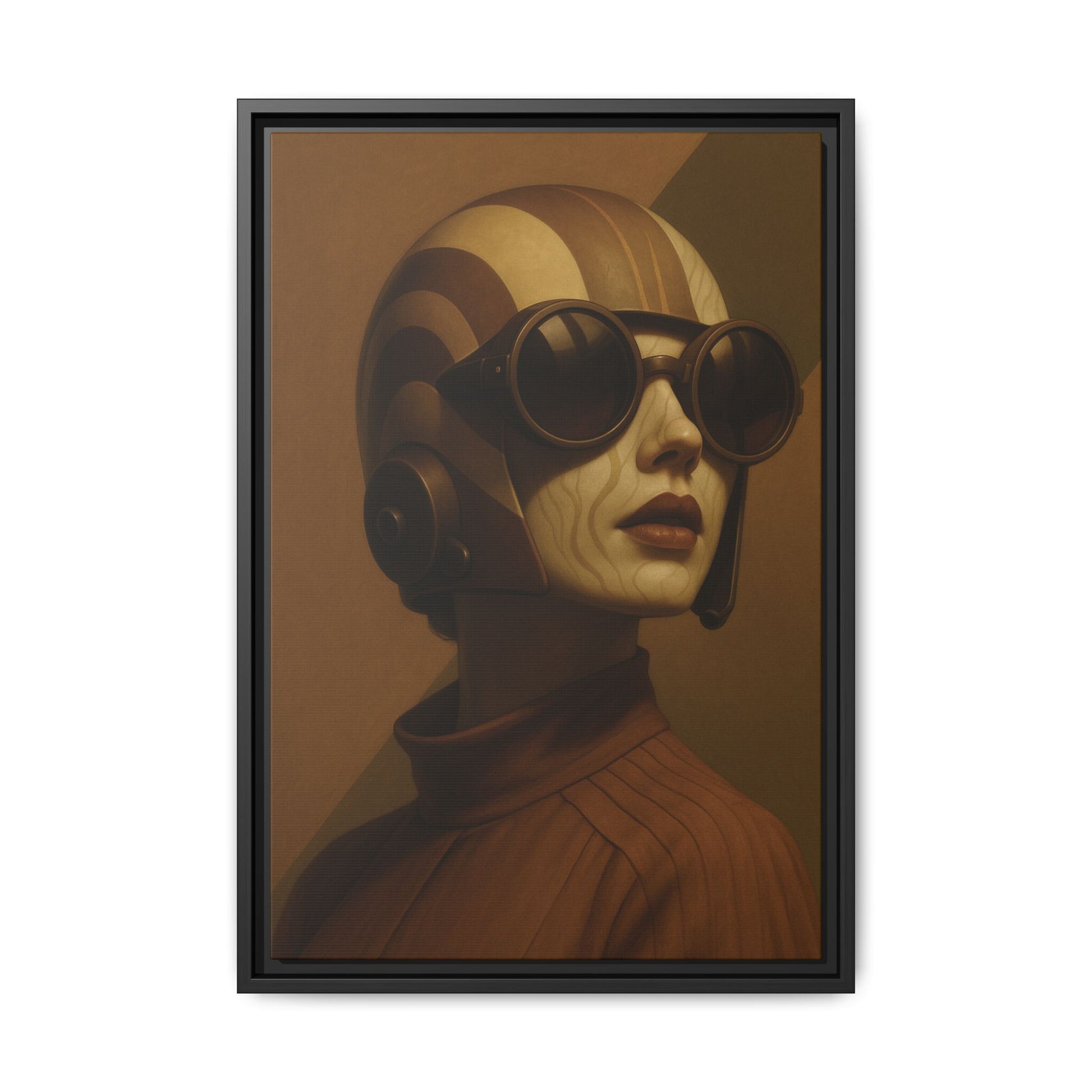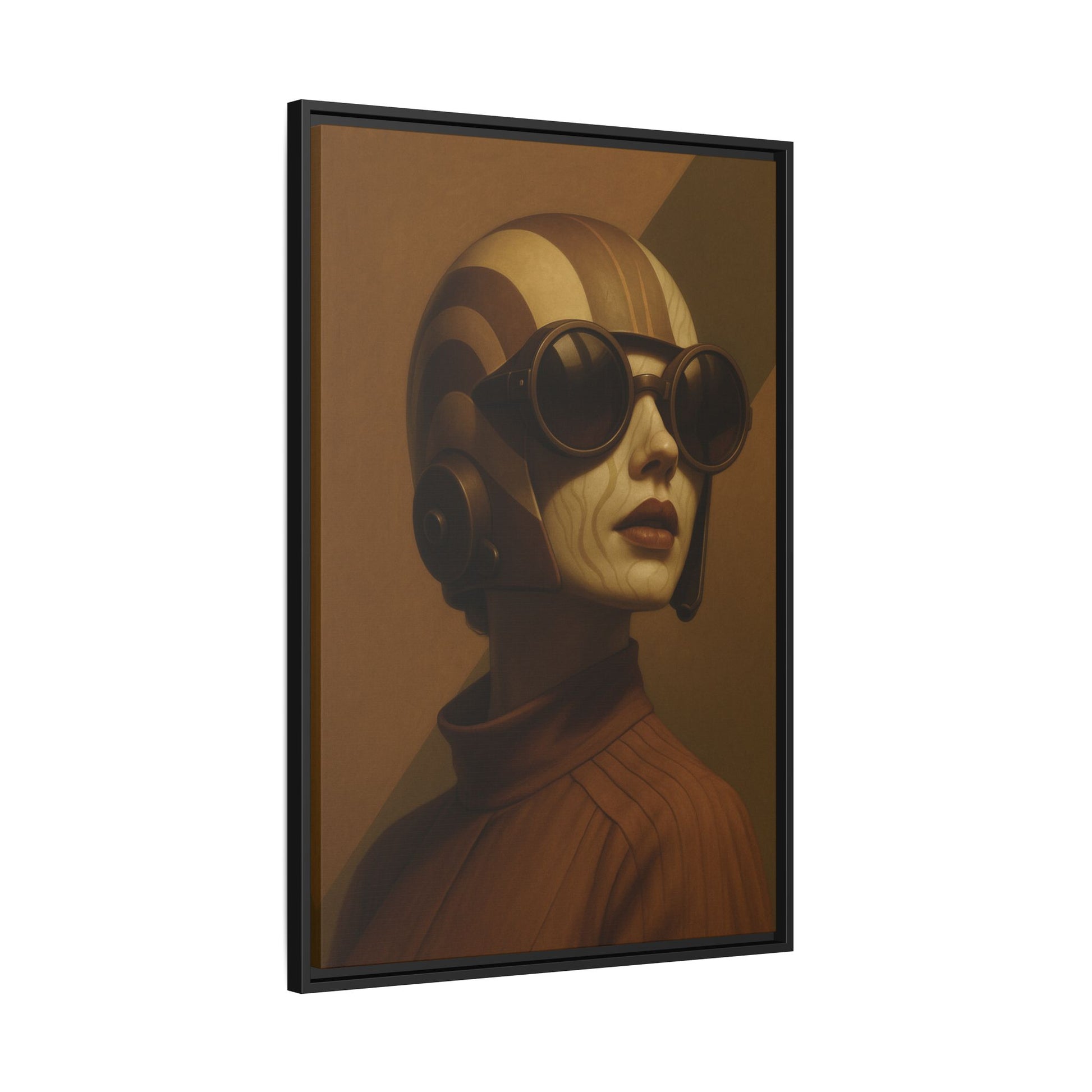 “Golden Velocity” captures the mystique of a retro-futurist heroine cloaked in warm sepia tones and vintage allure. Wearing a striped helmet and oversized goggles, the figure stares ahead with composed confidence, as golden lines subtly cascade down her face—hinting at motion, time, or transformation. The piece feels both cinematic and timeless, a portrait of elegance wrapped in the language of speed and self-assured mystery.