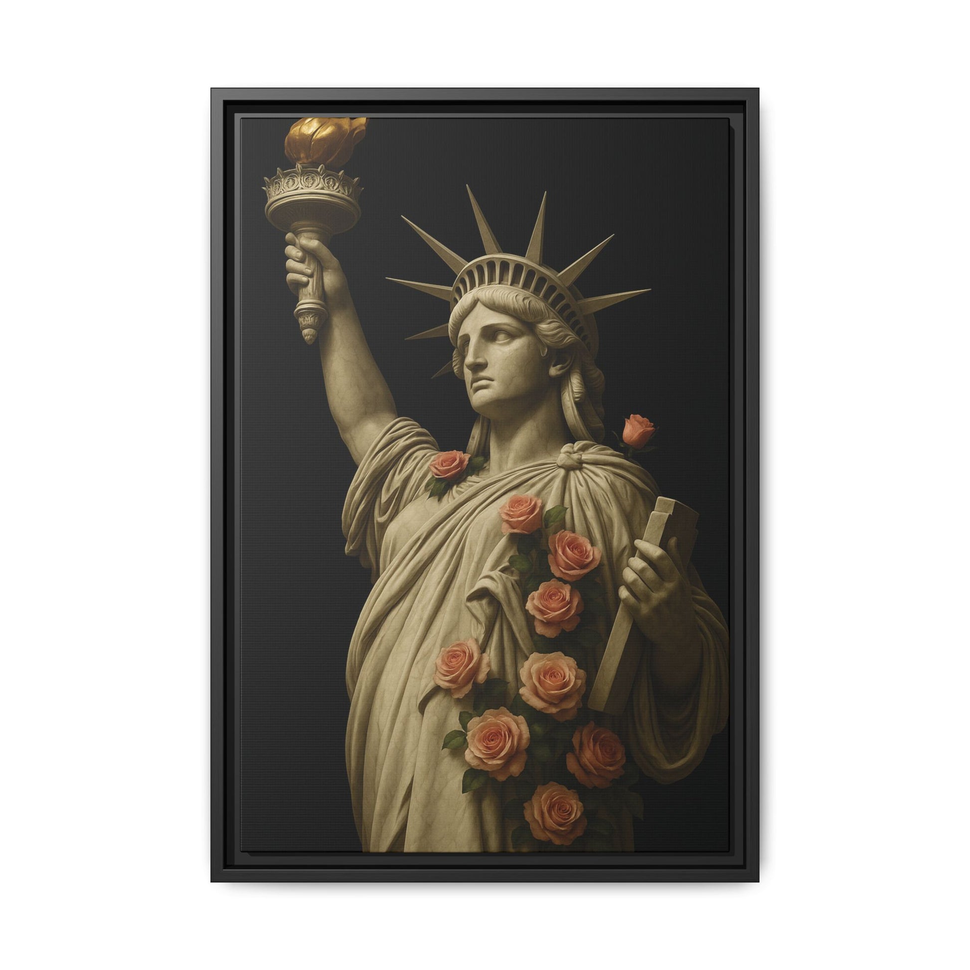 “Liberty in Bloom” is a poignant and poetic reimagining of the Statue of Liberty, where soft coral roses intertwine with the folds of her robe and bloom gently from her form. Illuminated against a deep black background, the iconic symbol of freedom is rendered not only as a beacon of strength, but also of grace, growth, and renewal. The flame she holds burns golden, while the roses speak to the enduring beauty of hope and compassion.