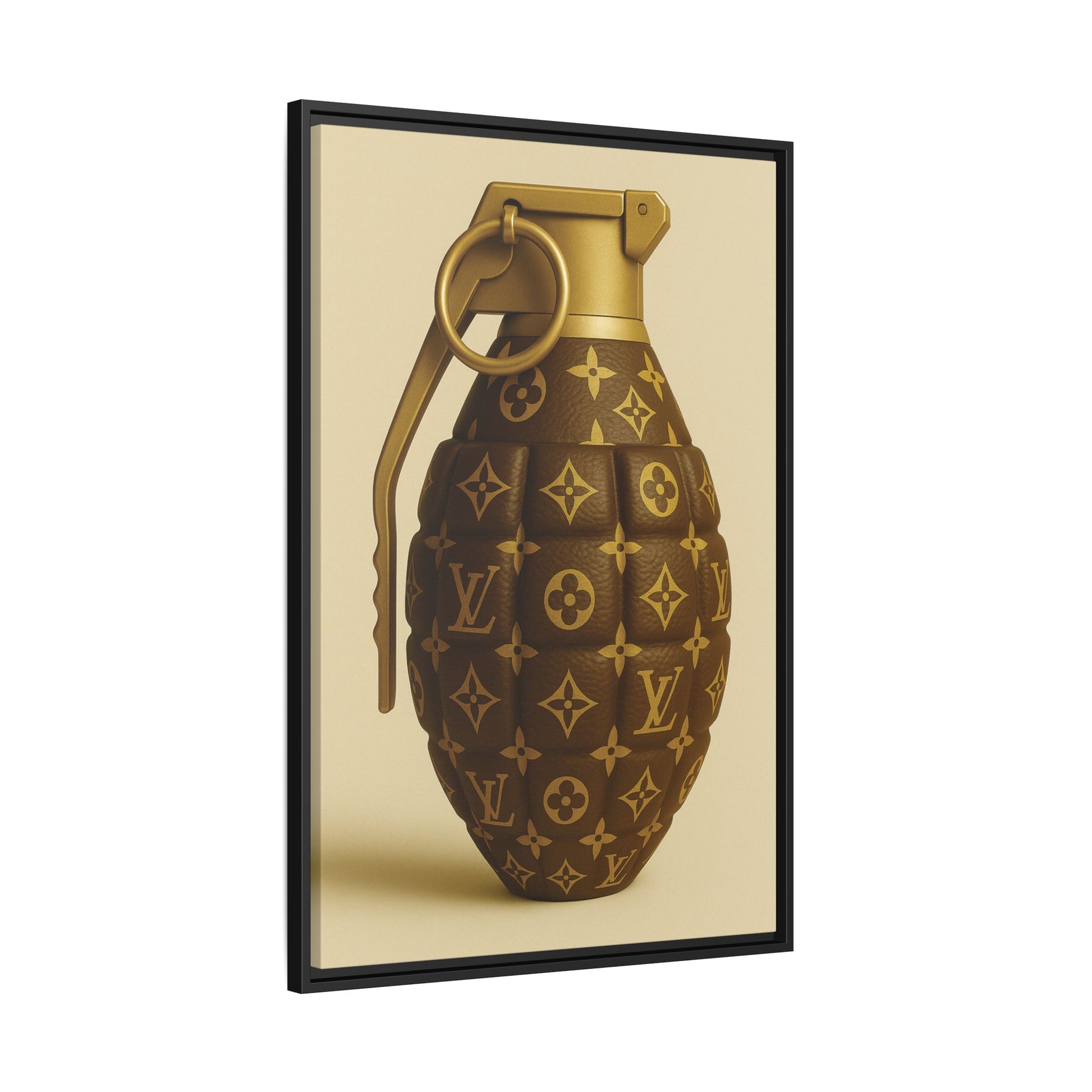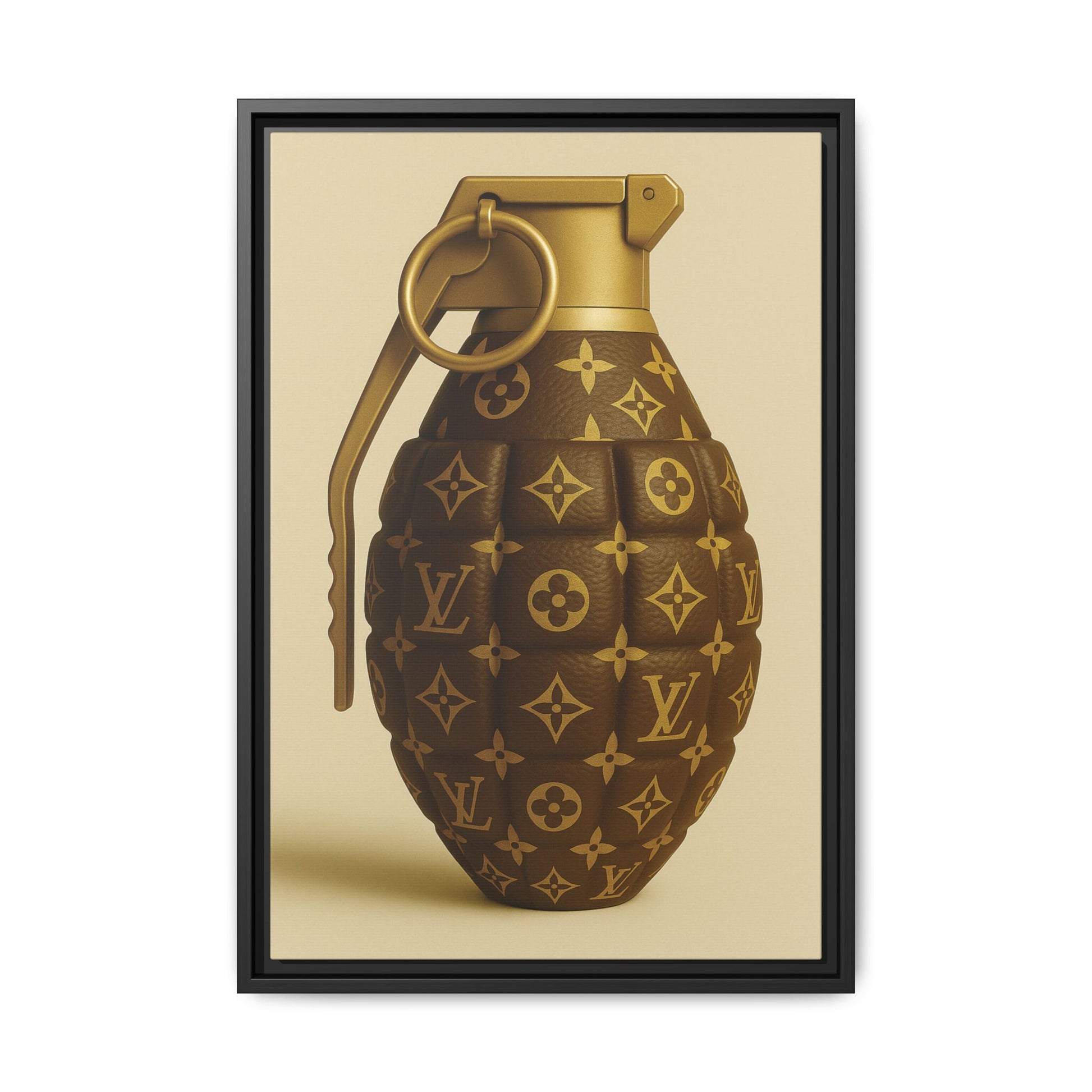 “High-End Detonation” is a bold and provocative canvas that fuses the language of luxury with the symbolism of chaos. This hand grenade, wrapped in iconic brown-and-gold designer monogram leather, transforms an object of destruction into a statement of elite power and aesthetic subversion. Gilded accents elevate the form, creating a tension between refinement and rebellion, fashion and force.