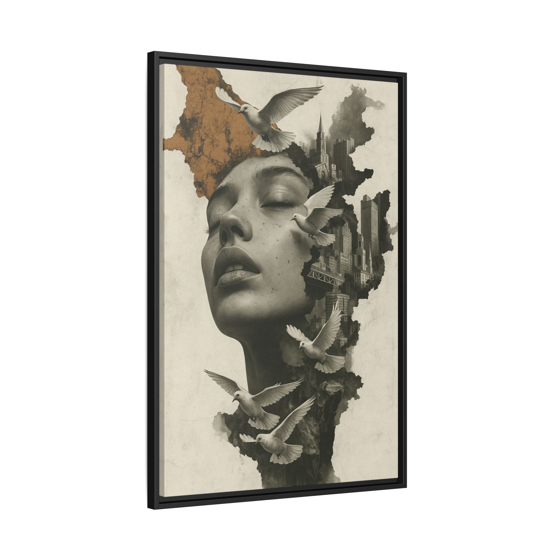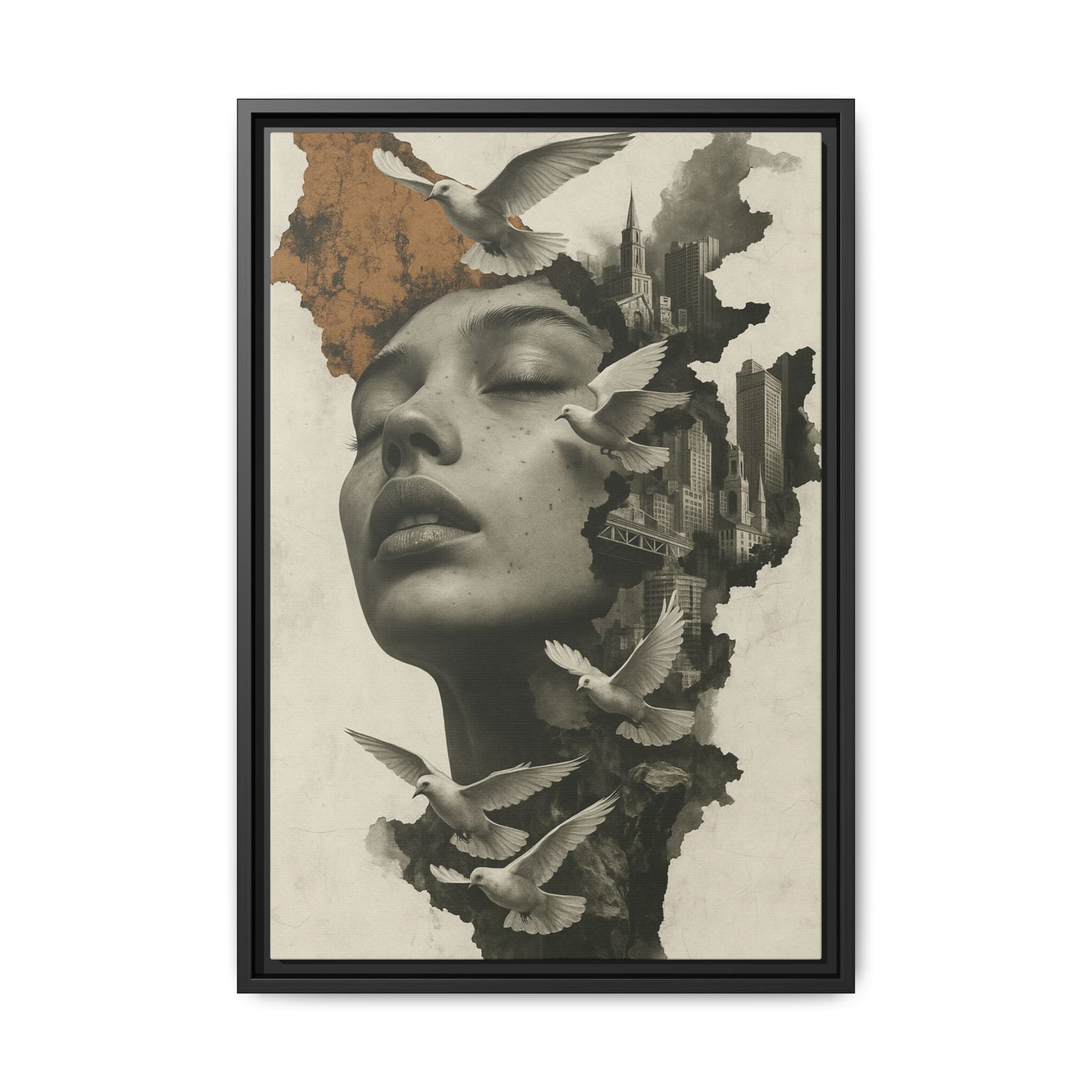 “Sanctuary Within” is a poetic visual meditation on freedom, memory, and inner refuge. A serene female face, eyes closed in stillness, emerges from a textured wash of cityscapes and architecture, while white doves burst outward—symbols of peace, release, and transcendence. The interplay between delicate realism and fragmented abstraction creates a dreamlike tension, where the mind becomes both a metropolis and a sanctuary. Touches of warm gold in the background hint at enlightenment amidst the chaos.