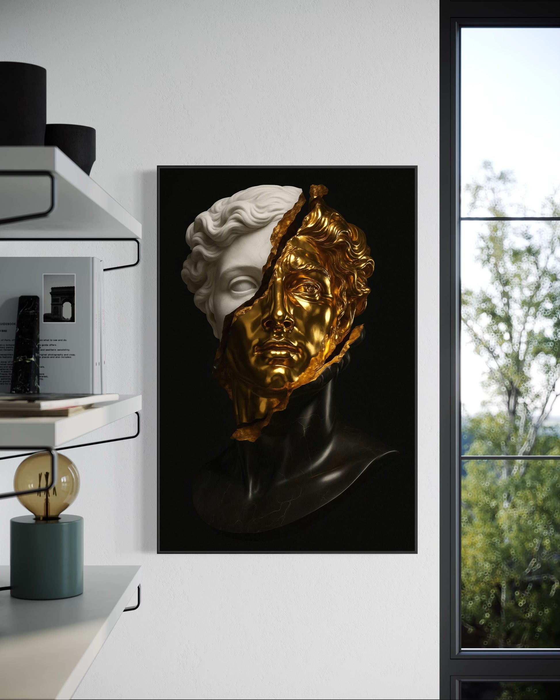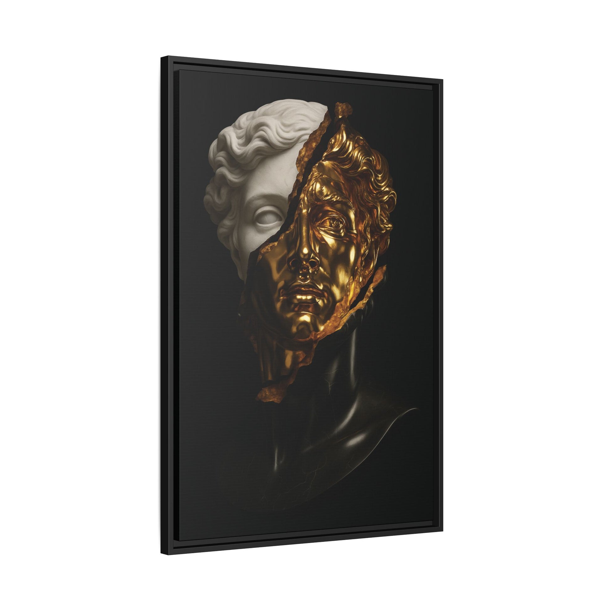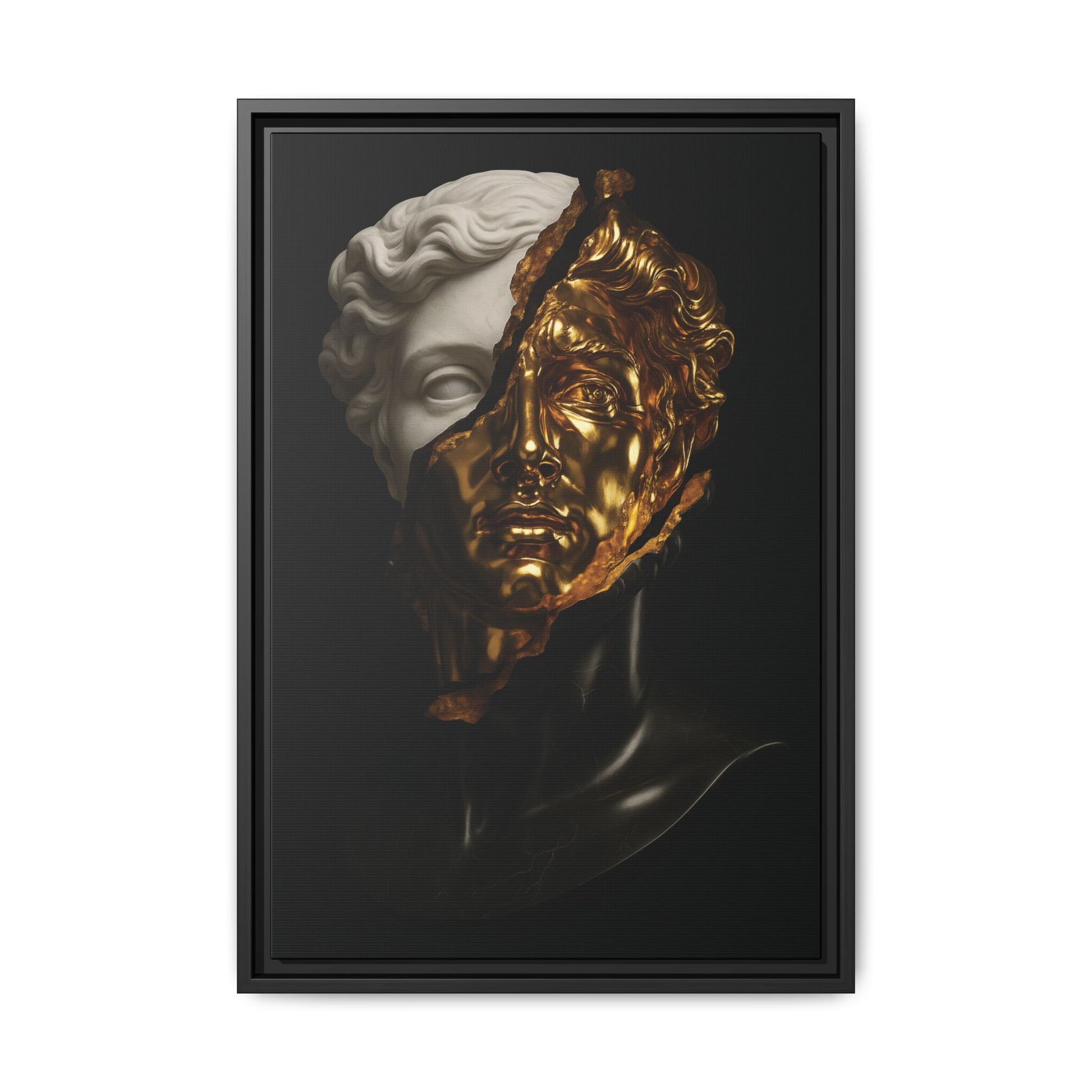 “Divine Rupture” is a breathtaking portrayal of transformation and duality. This sculpture fuses classical white marble with radiant molten gold, revealing a fractured visage where elegance meets opulence. The rupture down the face is both violent and beautiful — a metaphor for inner evolution, the tension between perfection and identity, and the rebirth of the self through contrast. Set against a deep black background, every texture glows with drama and depth.