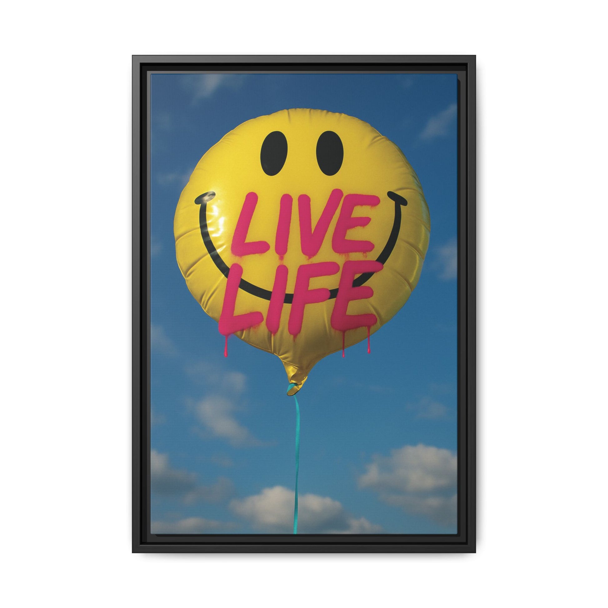 Live Life Balloon captures a bold burst of joy with a rebellious edge. A vibrant yellow smiley face floats against a clear sky, defaced in neon pink graffiti with the words “LIVE LIFE” dripping confidently across its cheerful facade. The contrast between innocence and urban expression creates a striking visual anthem for freedom, optimism, and unapologetic self-expression. Perfect for modern interiors with a playful, street-art twist.