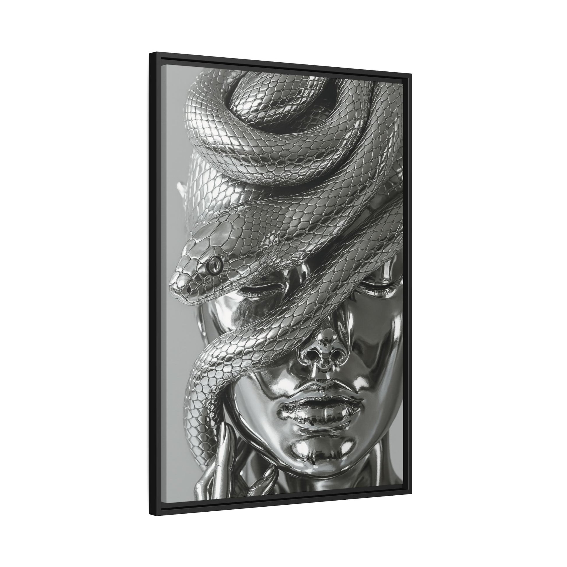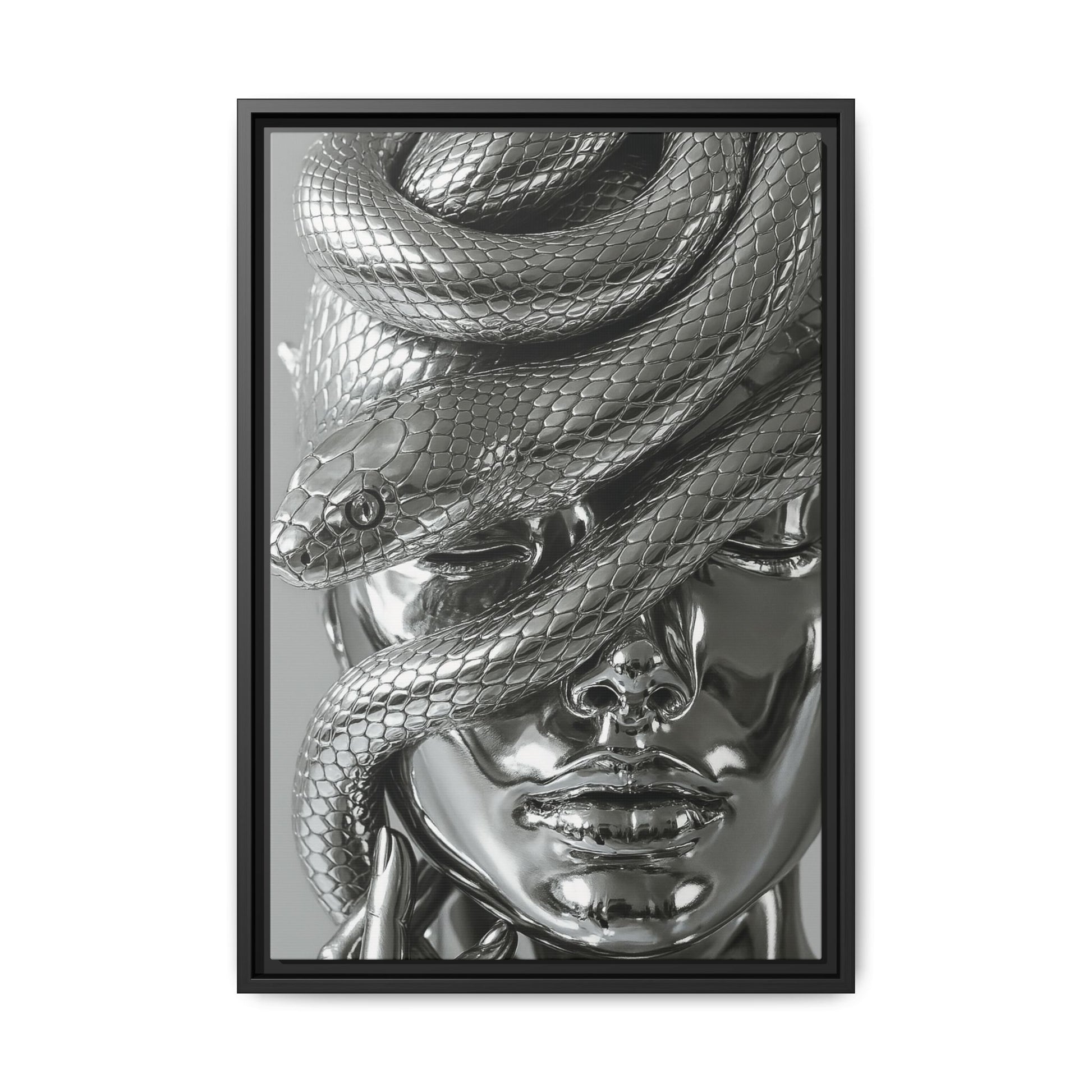 Venom & Vanity is a hyper-polished portrait of power, temptation, and allure. Cast entirely in liquid chrome, the sculpture fuses a serene feminine visage with the poised tension of a coiled serpent, its scales reflecting light with exquisite precision. The snake’s hypnotic path over closed eyes and parted lips evokes mythic themes of seduction, danger, and divine beauty. A bold statement in modern surrealism, where elegance meets edge in radiant metallic perfection.