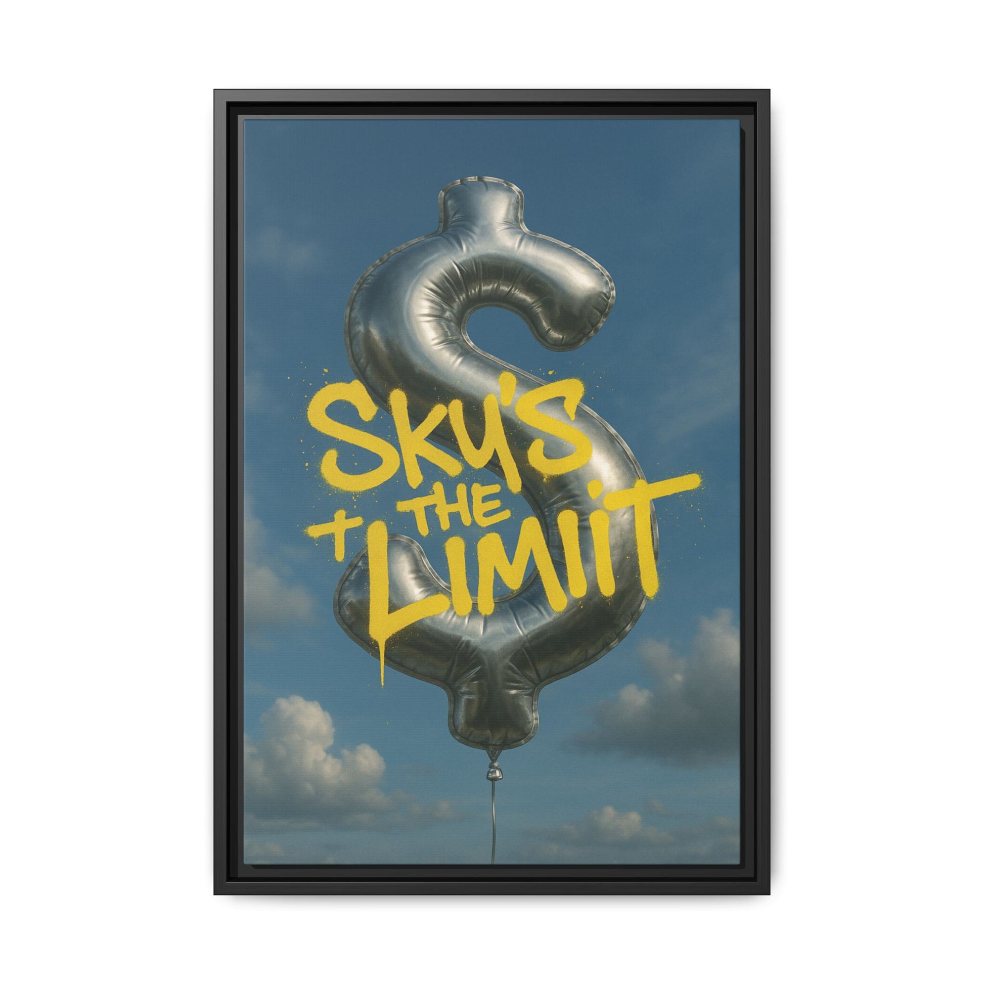 This luxurious canvas artwork showcases a radiant silver dollar-sign balloon floating with effortless grace against a tranquil, blue sky adorned with soft, cotton-like clouds. Boldly layered across its surface in rich, golden-yellow spray-paint is the empowering phrase “Sky’s the Limit,” rendered in a modern graffiti style that blends urban edge with refined elegance. The contrast between the reflective metallic surface and the raw, expressive typography evokes a powerful message of ambition, wealth, and limitless potential. Perfect for sophisticated interiors, this piece is a celebration of bold dreams and high aspirations — a visual anthem for those who strive for more.