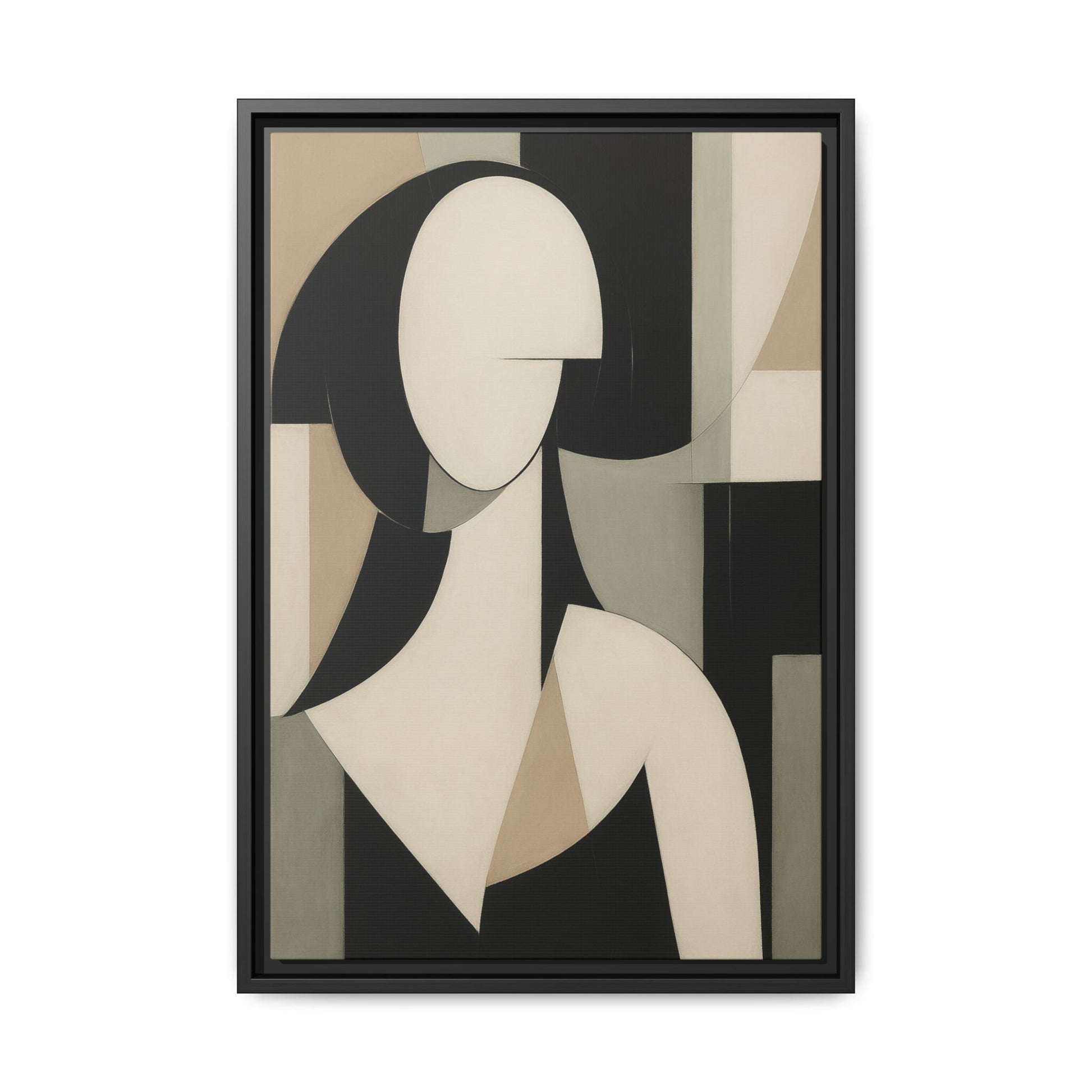 A minimalist cubist portrait in muted neutrals and black, depicting a stylized female figure. The composition is both serene and enigmatic, channeling Picasso-esque elegance.