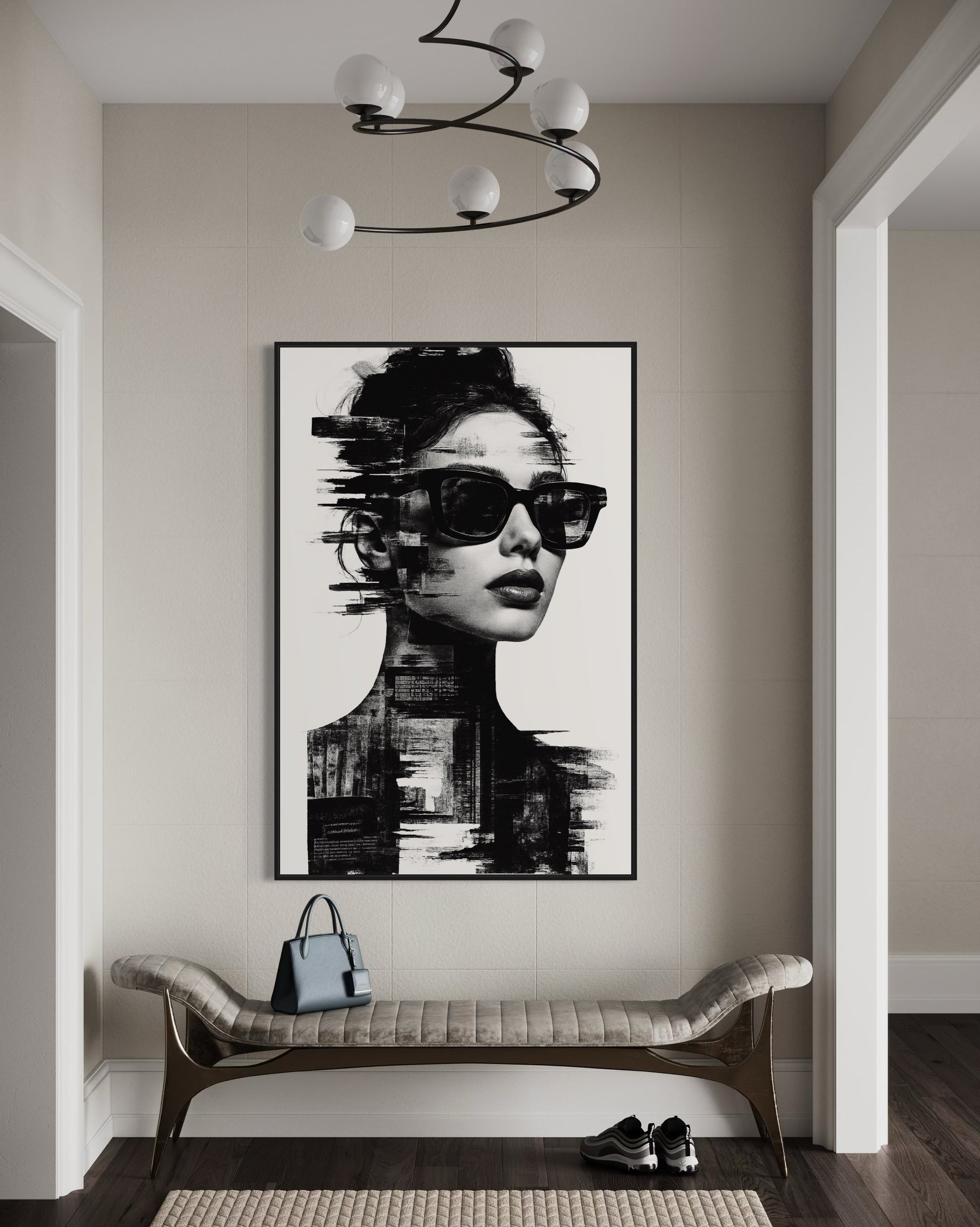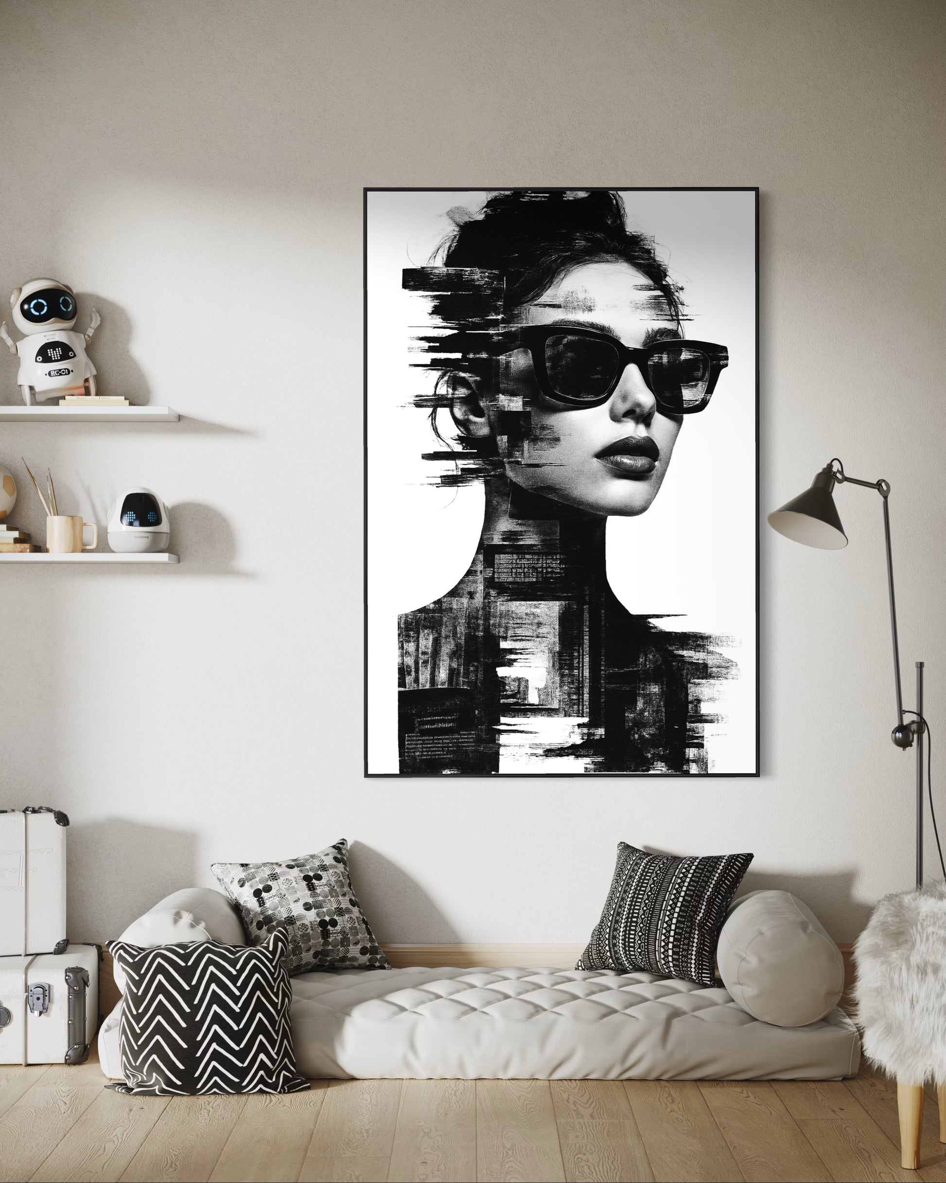 A monochromatic portrait of a woman in sunglasses dissolves into glitch-like textures and digital decay. The piece reflects themes of identity in the digital age, fragmentation of self, and the beauty in imperfection.