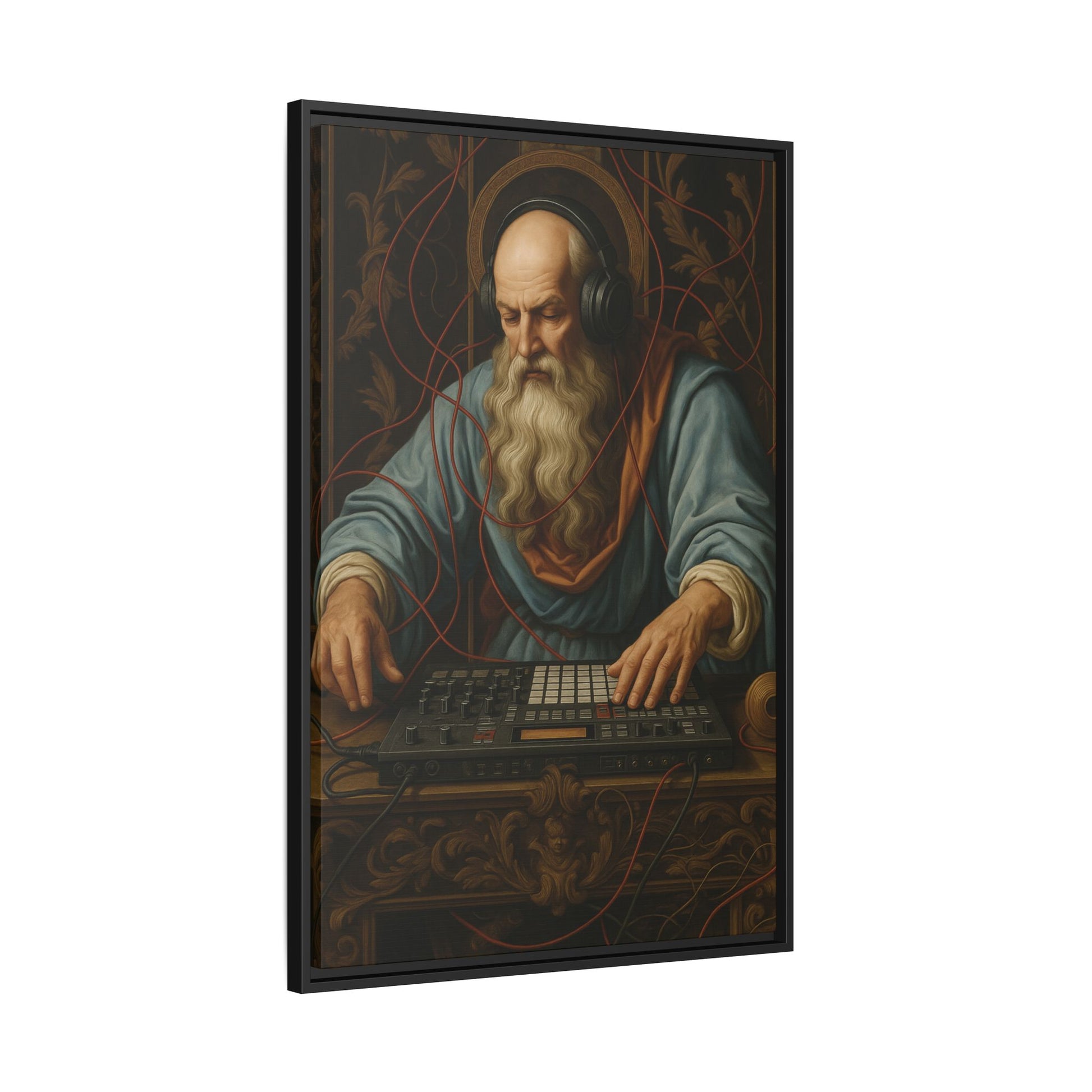 A Renaissance-inspired figure resembling a saint operates a modern music production controller, surrounded by flowing wires like divine threads. This clever fusion of sacred art and contemporary tech elevates beatmaking to a spiritual ritual.
