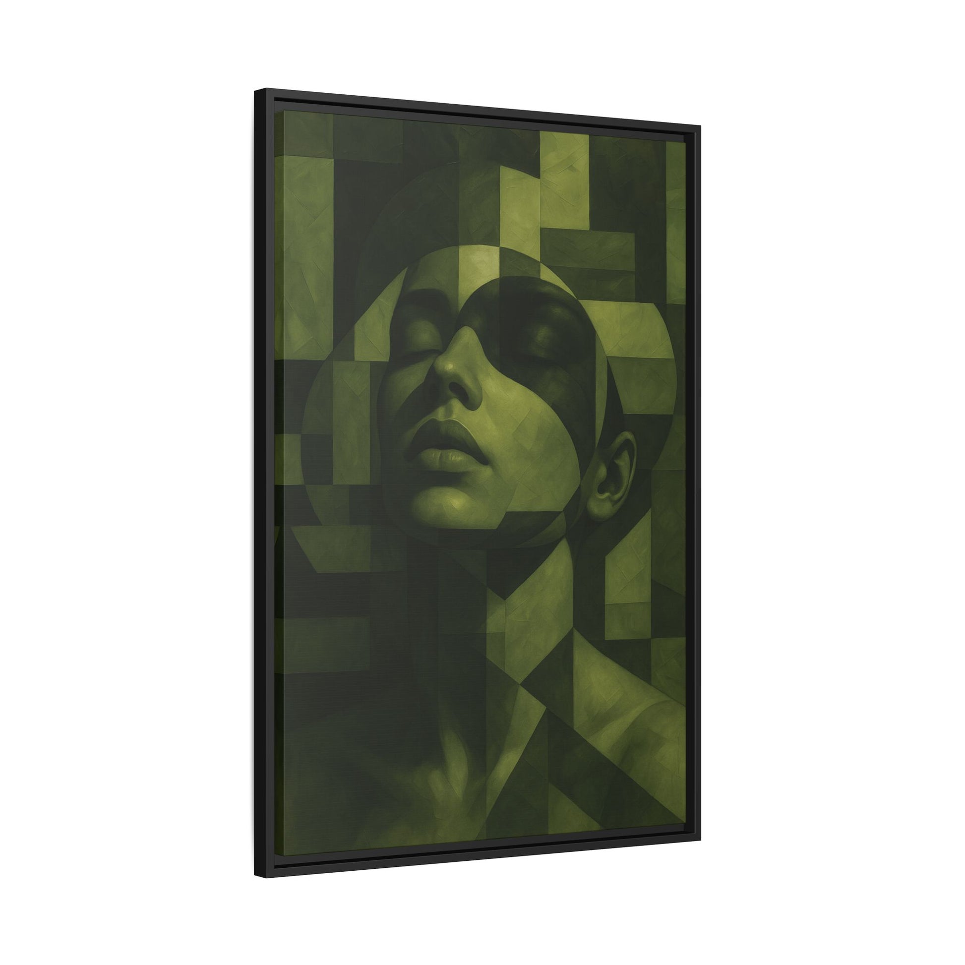 A cubist, monochrome portrait composed of geometric panels in varying shades of green. The subject’s face emerges from abstraction, balancing strength and vulnerability.