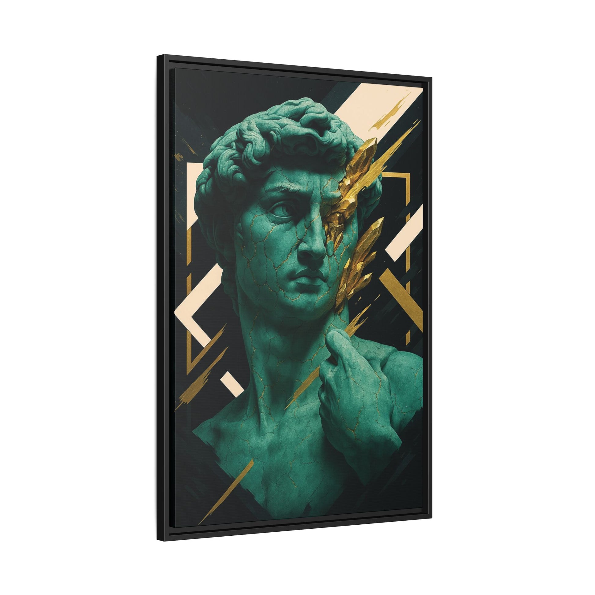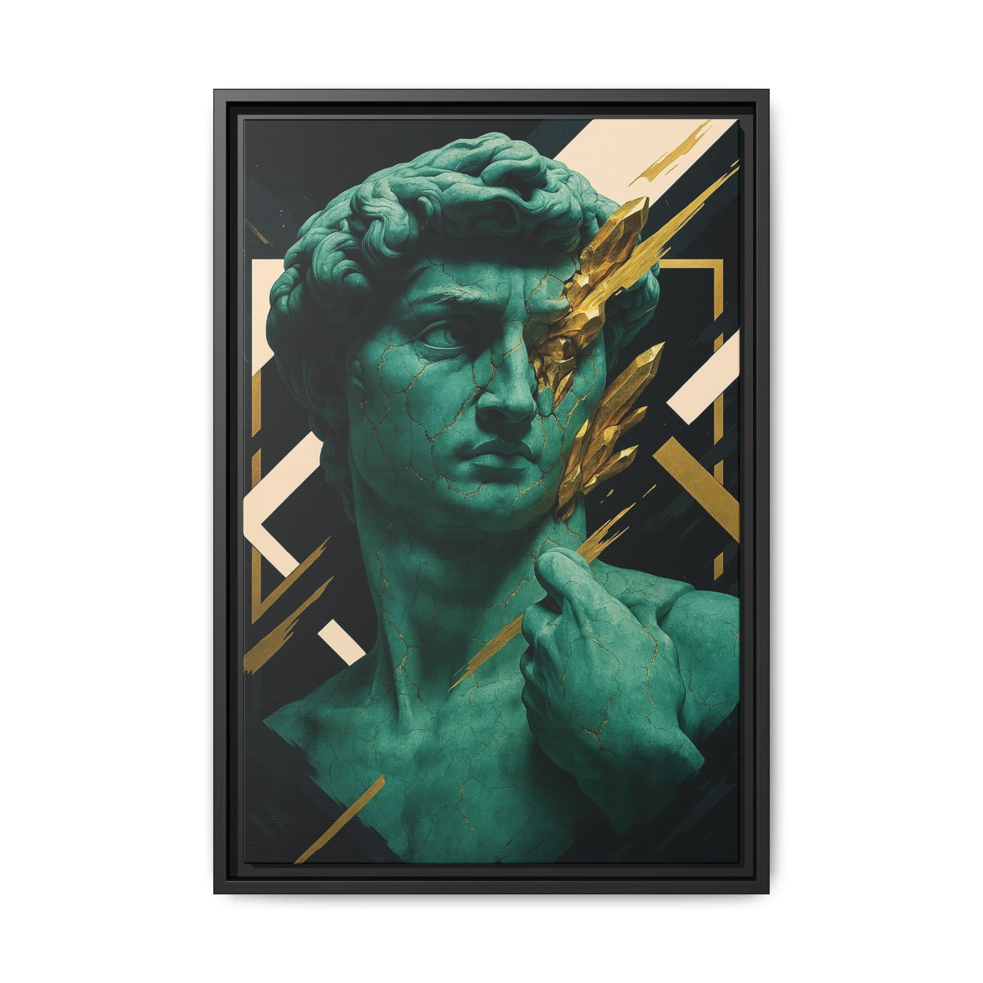 A bold fusion of classic sculpture and modern luxury. This artwork reimagines Michelangelo's David in deep jade tones with gold cracks and crystal shards - symbolizing strength through imperfection. framed by sharp geometric lines in black and gold, it brings power, elegance, and edge to any refined space