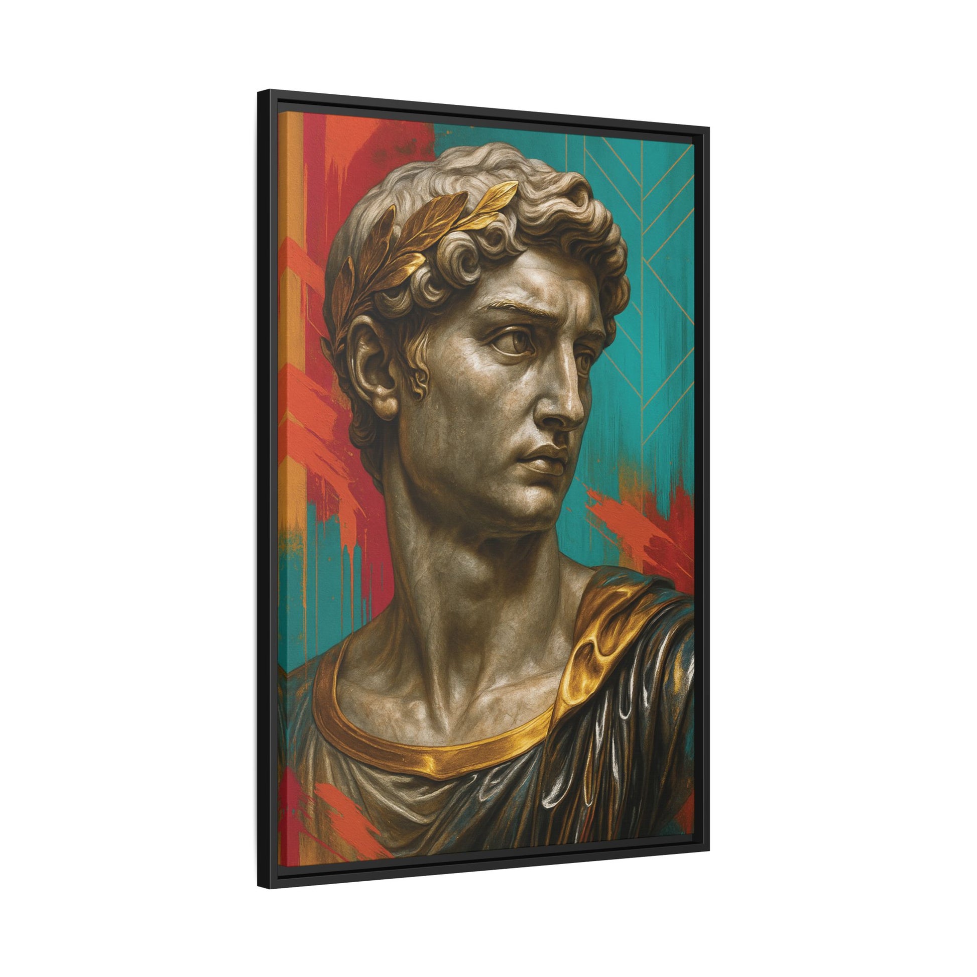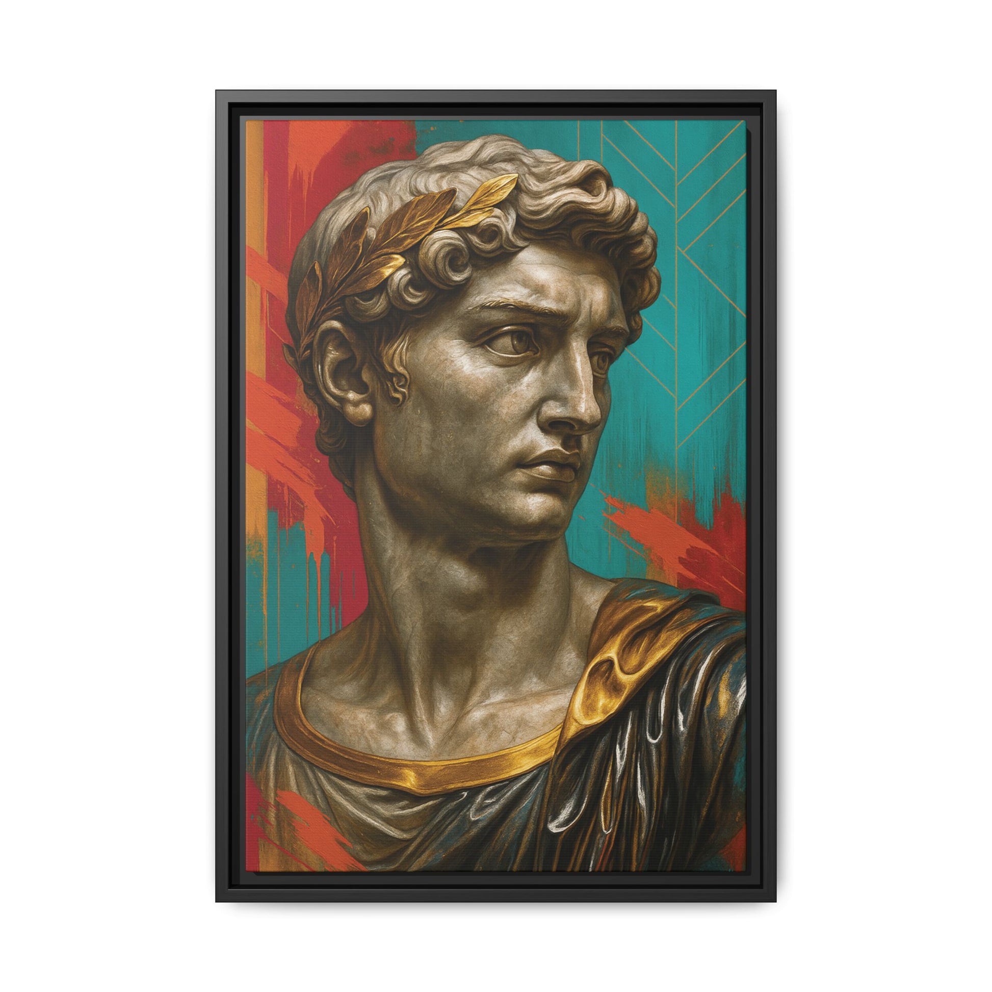 A regal marble bust adorned with a golden laurel and accents stares intensely into the distance. Set against a vibrant background of turquoise and orange brushwork, it blends imperial grandeur with contemporary street art flair.