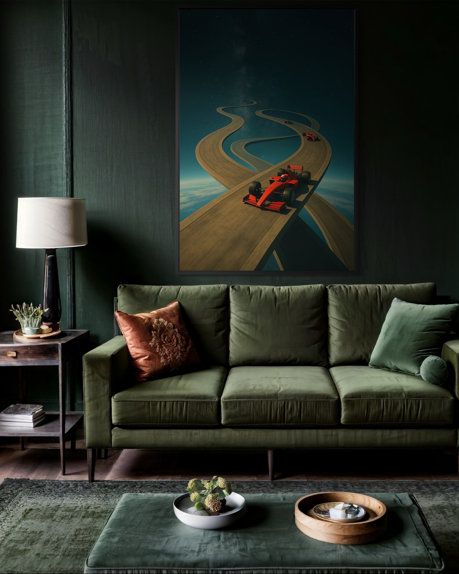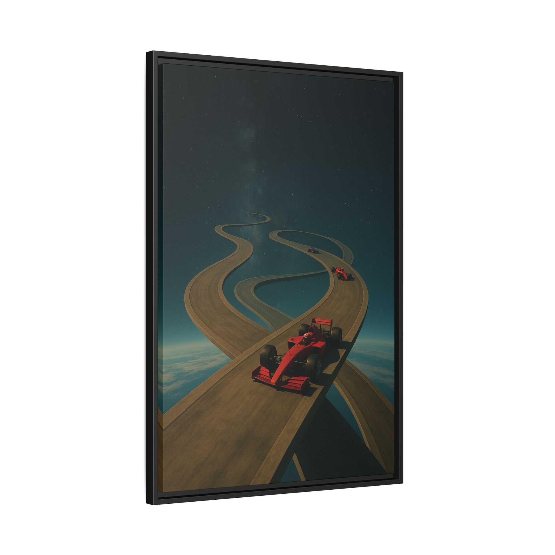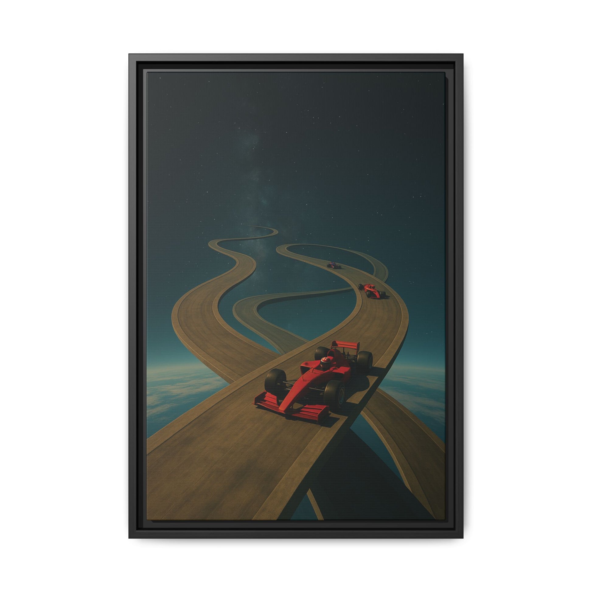 A surreal, gravity-defying raceway twisting through the cosmos, with Formula 1 cars racing high above Earth under a star-drenched sky. A fusion of adrenaline and imagination.