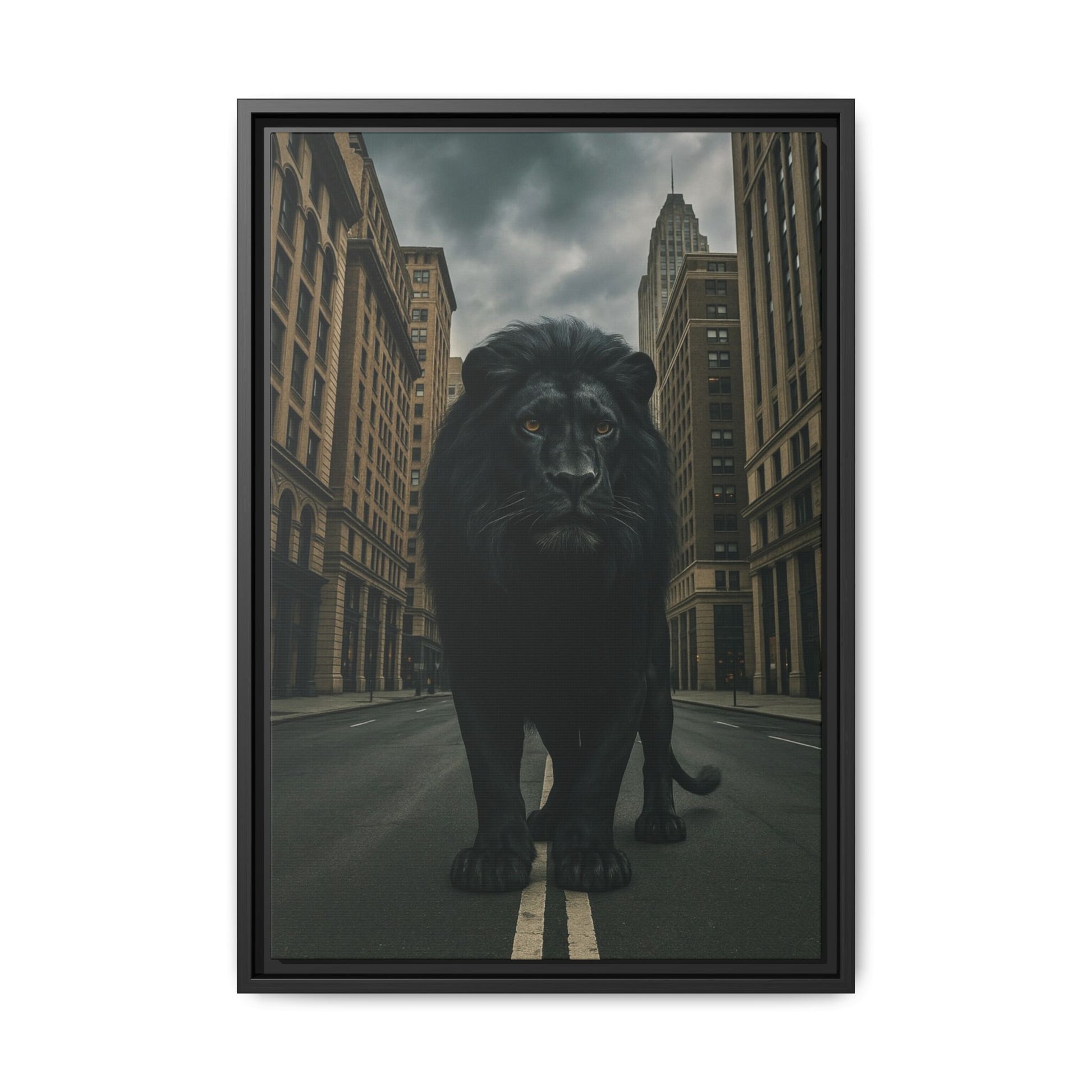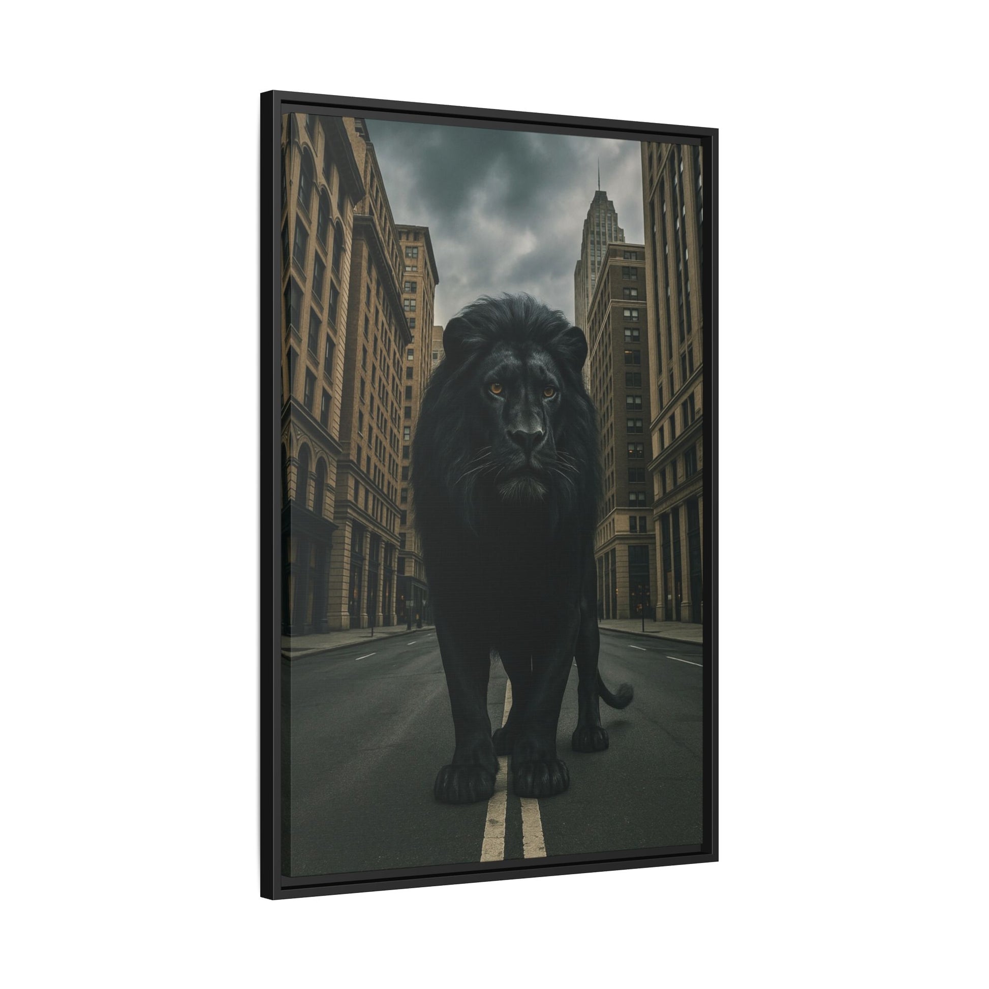 A powerful black lion strides through an empty urban street, framed by towering city buildings under moody skies. The image exudes dominance and calm authority—symbolizing fearlessness and the presence of power in unfamiliar territory.