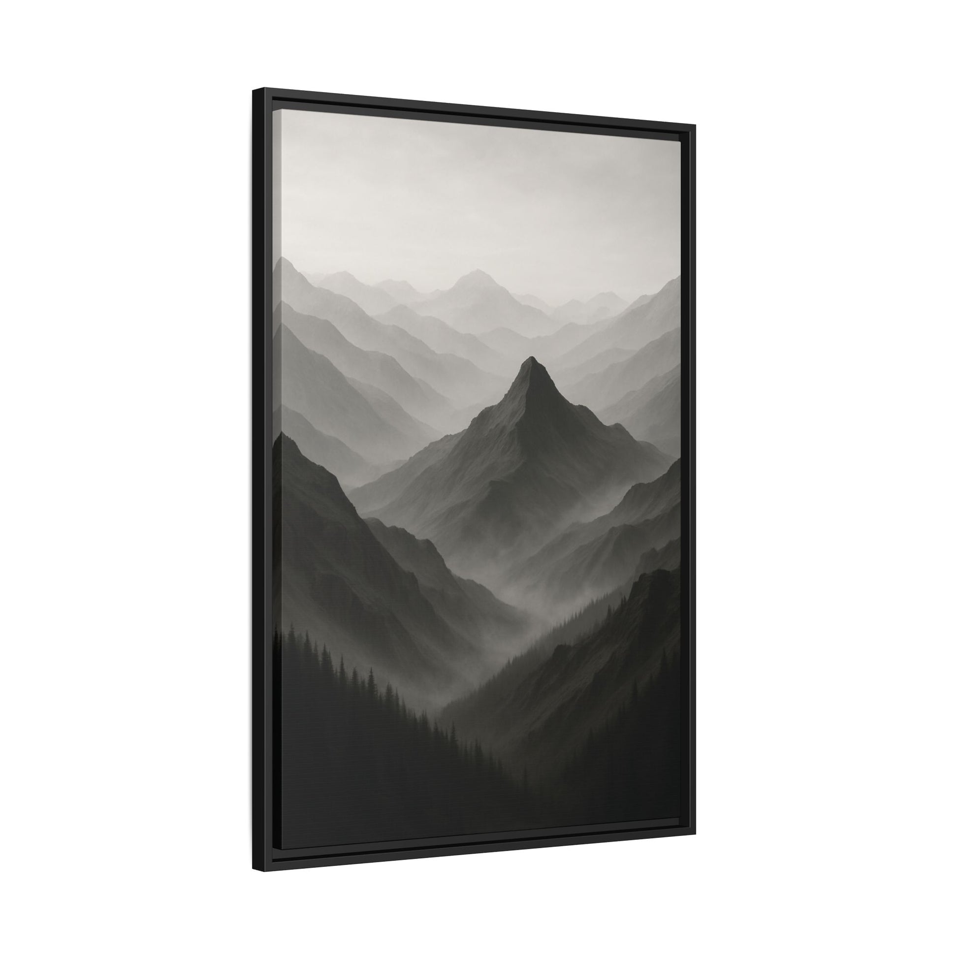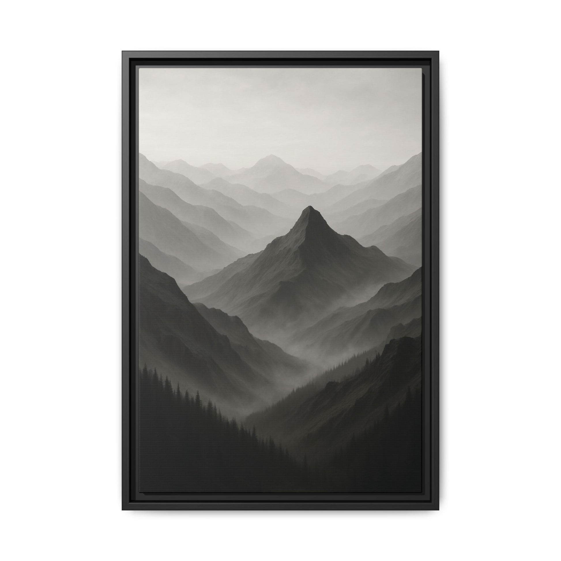 A grayscale mountain landscape fades into atmospheric haze, with towering peaks rising like ancient monuments. This meditative image captures the sublime silence of nature’s grandeur—evoking awe and solitude.