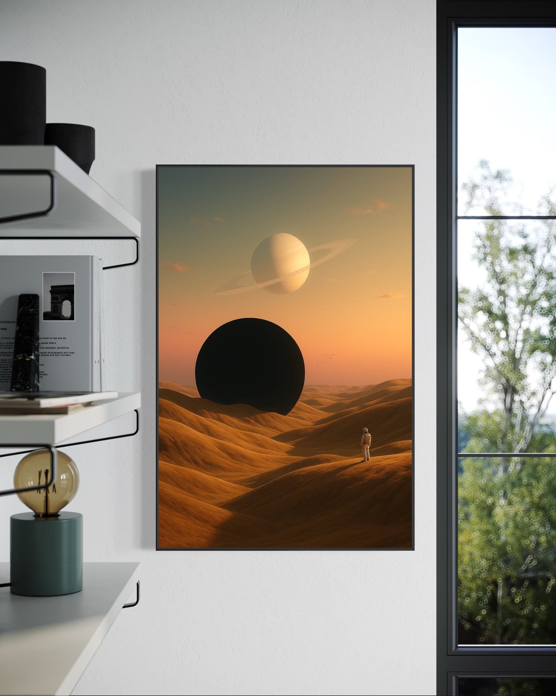 A surreal desertscape is interrupted by a massive black sphere and a pale Saturn in the sky. A lone figure in a spacesuit gazes at the scene. This enigmatic piece symbolizes the awe and fear of the unknown and the vastness of cosmic discovery.