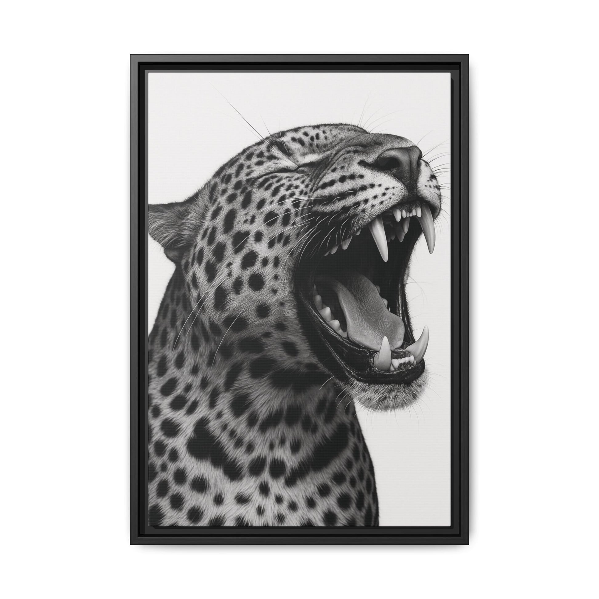 A photorealistic leopard lets out a ferocious roar in striking black and white. Every whisker and tooth captured in vivid detail, this piece celebrates untamed energy and the raw essence of nature’s fiercest predators.