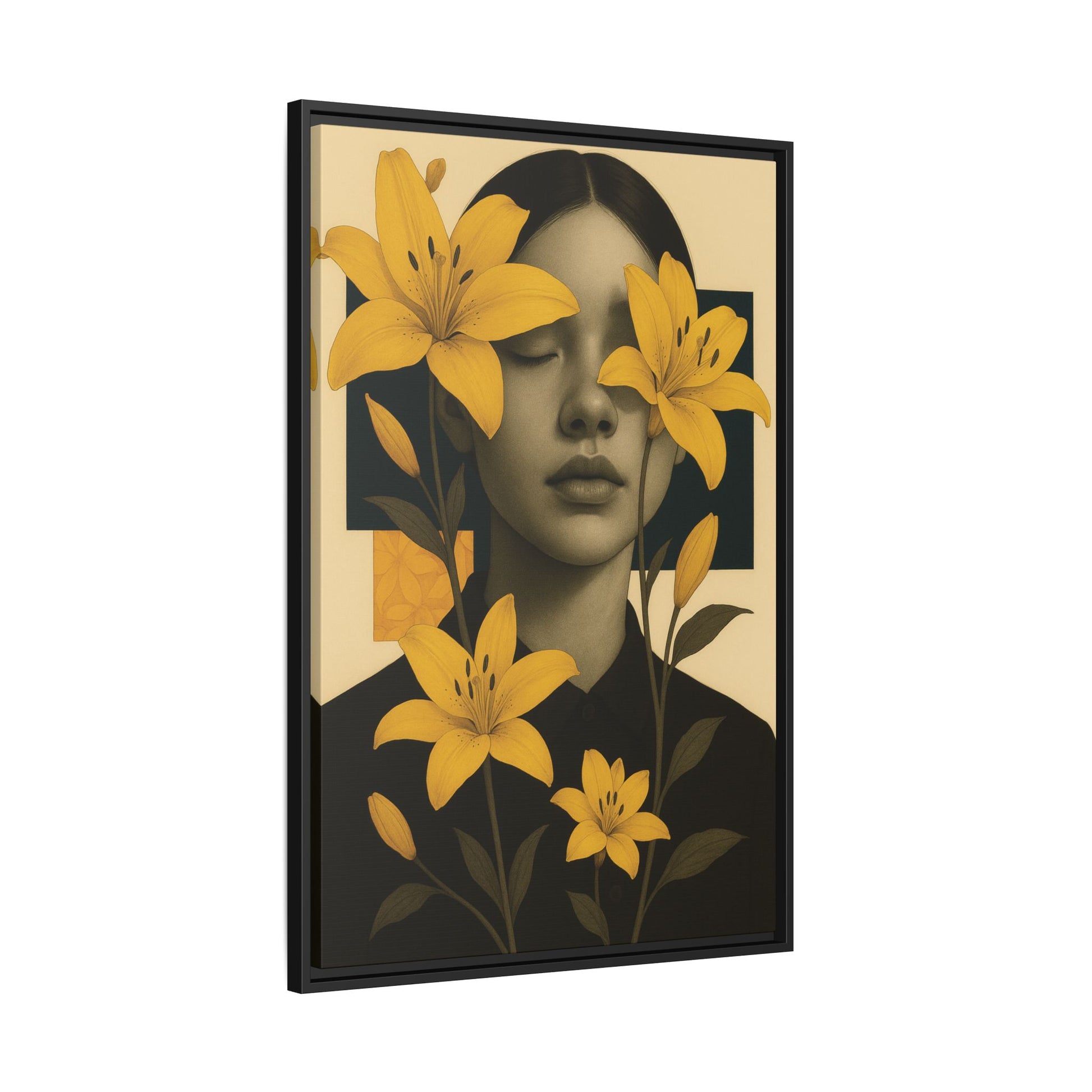 A calm, introspective portrait where yellow lilies obscure the subject’s eyes. Evoking serenity and emotional depth, it balances bold color with delicate silence.