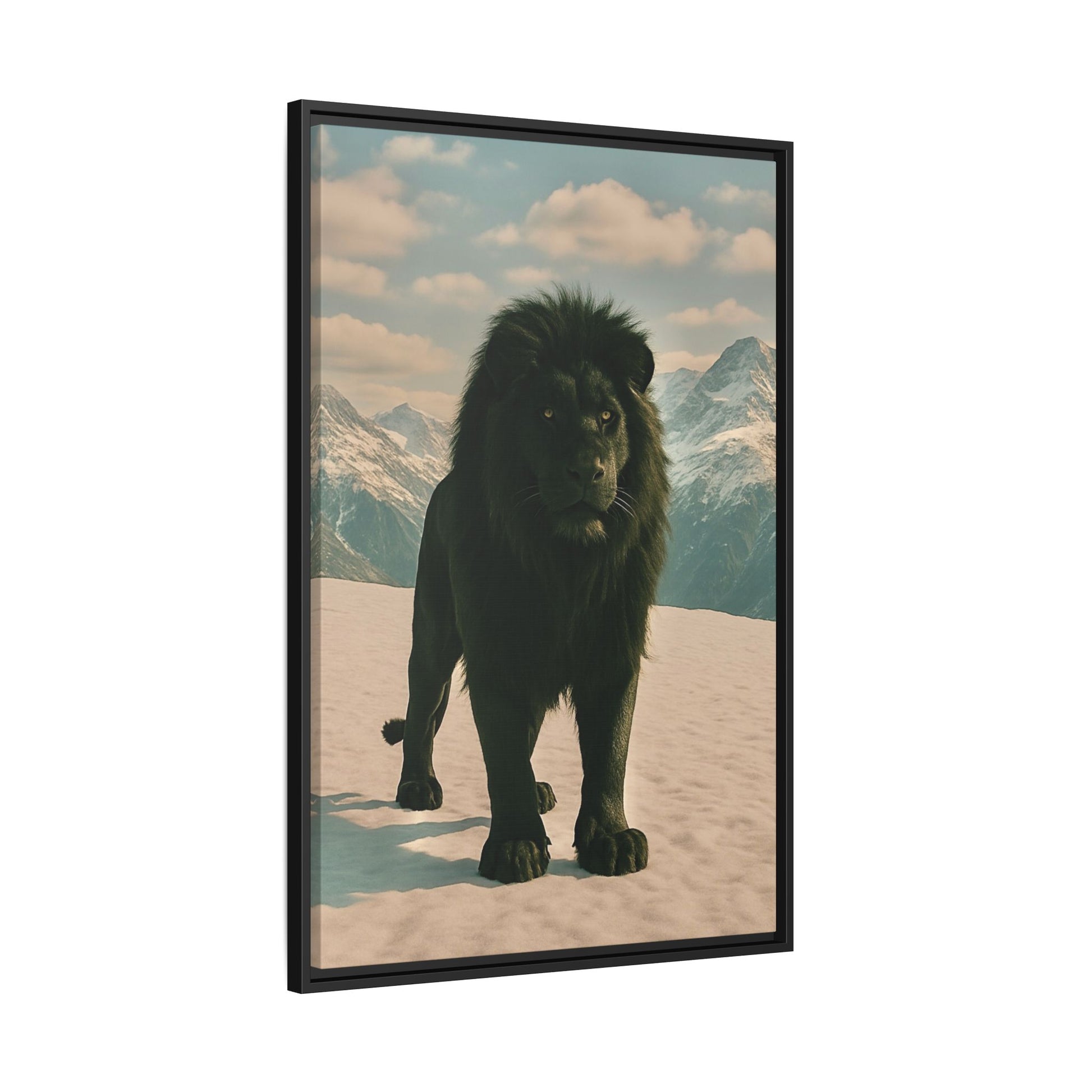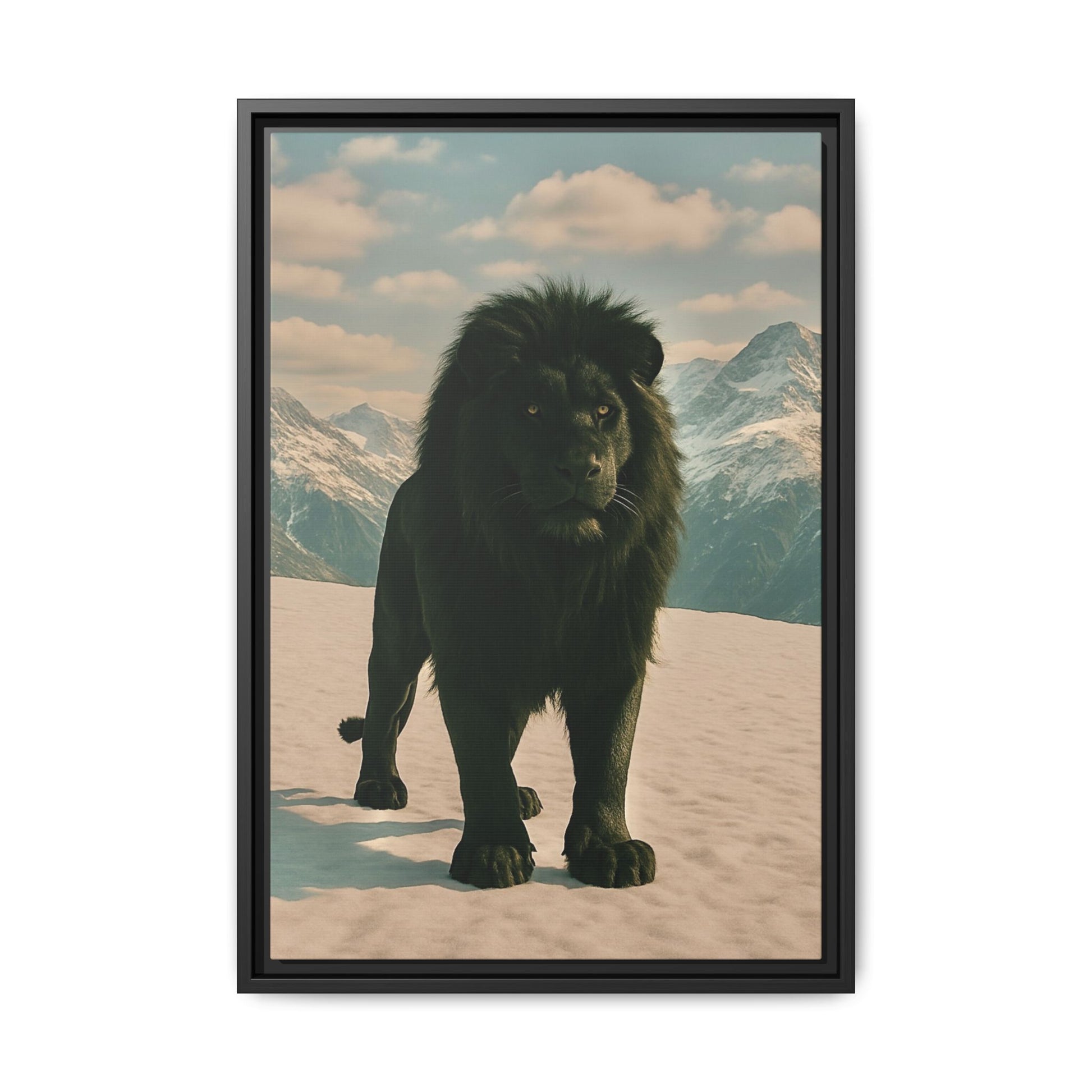 A majestic black lion stands on a snowy plateau with mountains rising behind. The rare juxtaposition of wild strength and icy serenity makes this portrait a symbol of resilience, grace, and silent might.