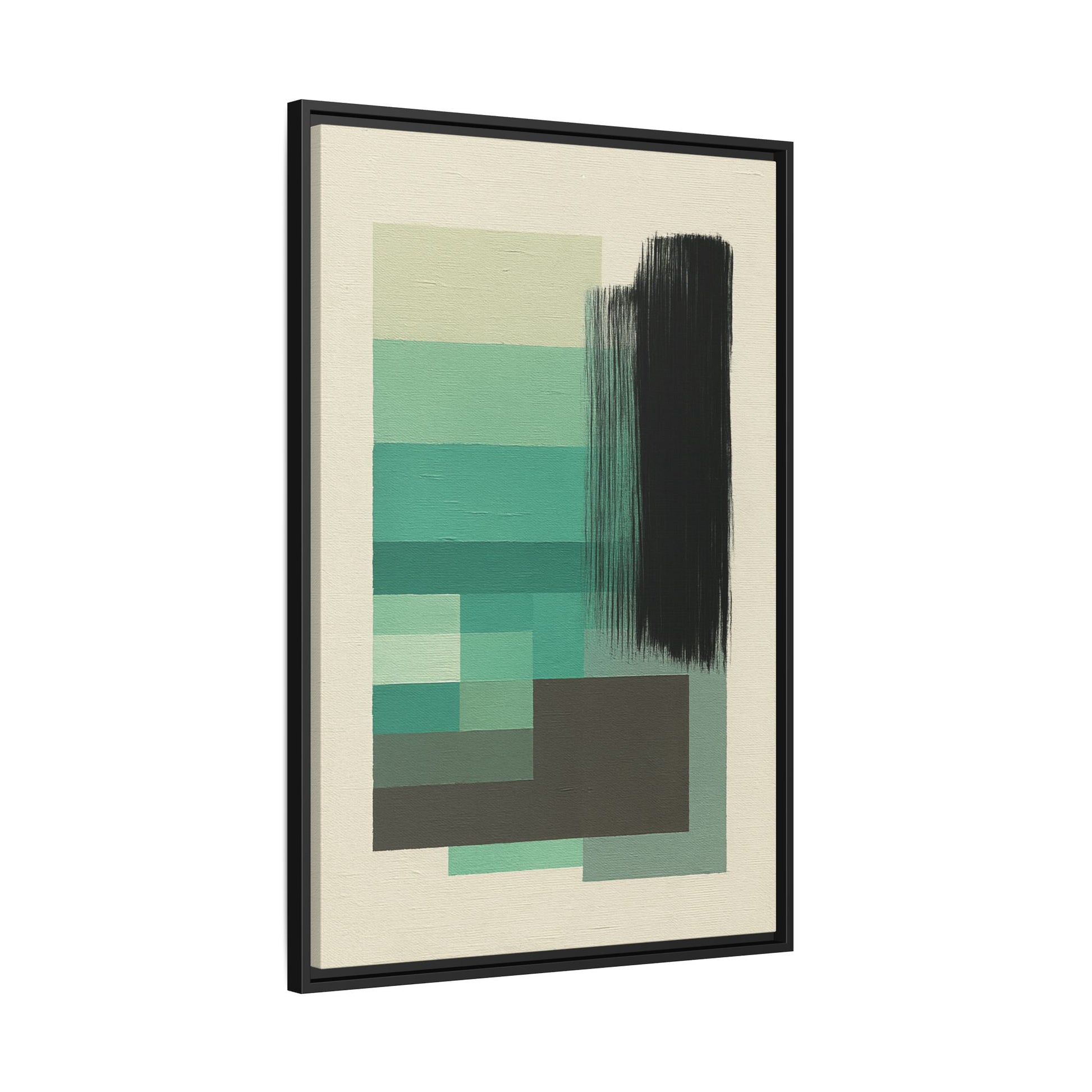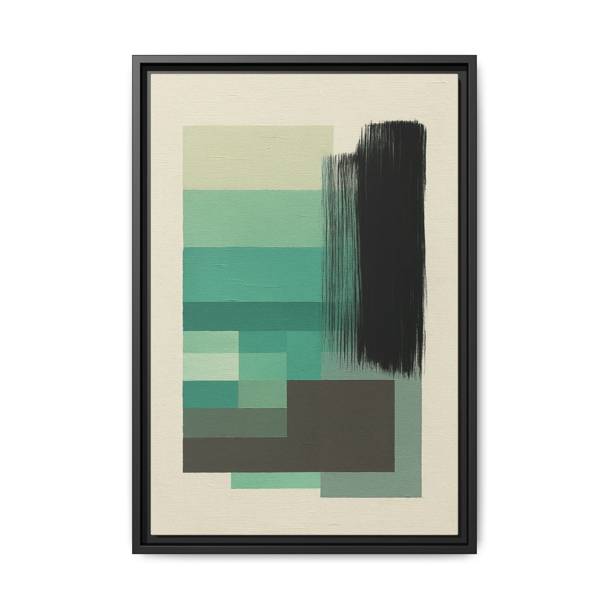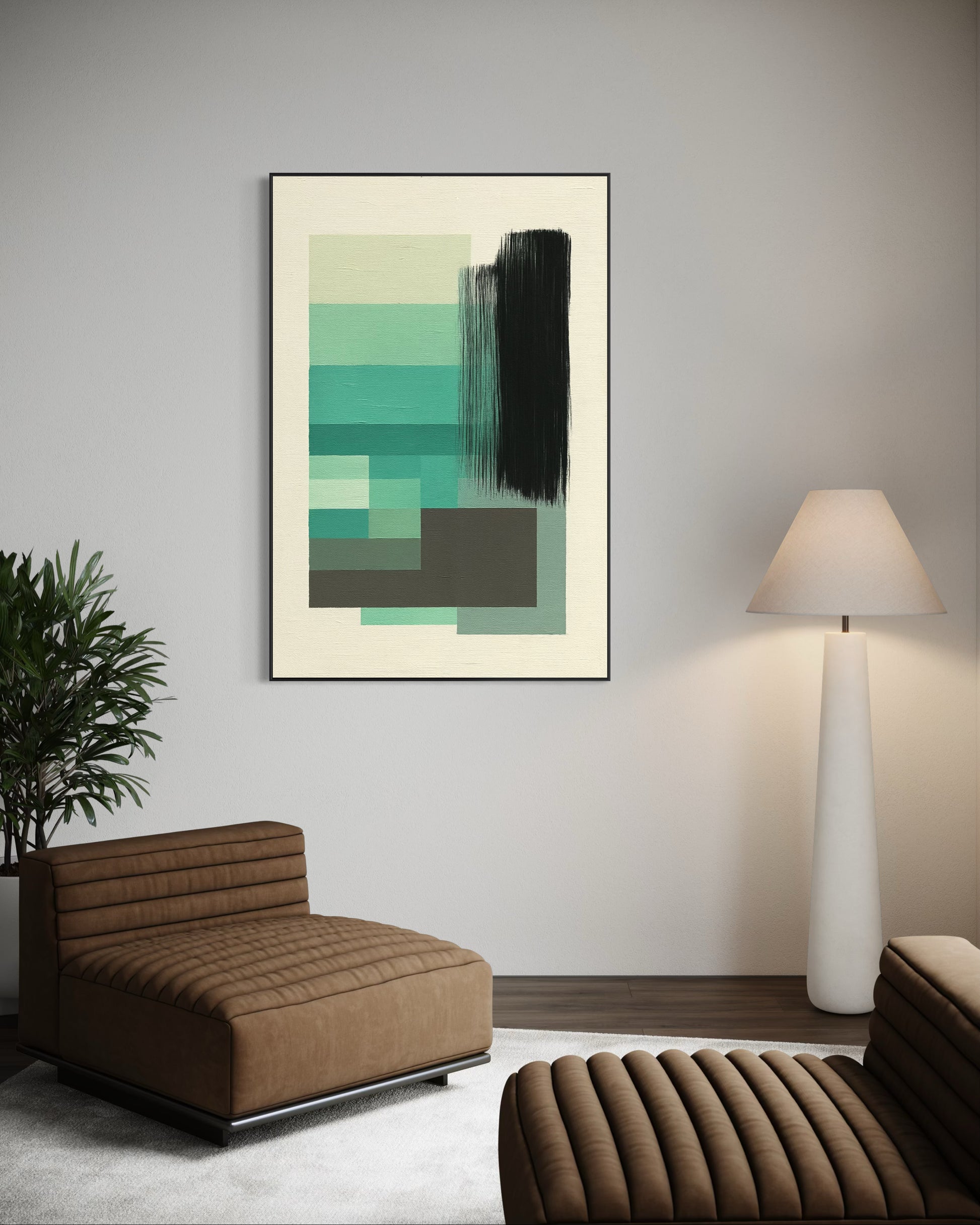 Structure & Spill is a modern abstract composition that balances precision and spontaneity. Clean blocks of mint, sage, and teal green form a geometric grid, disrupted by an expressive cascade of black brushstrokes flowing vertically across the canvas. The interplay of rigid order and raw texture invites reflection on control versus chaos, making it a bold yet contemplative piece perfect for minimalist or contemporary interiors.