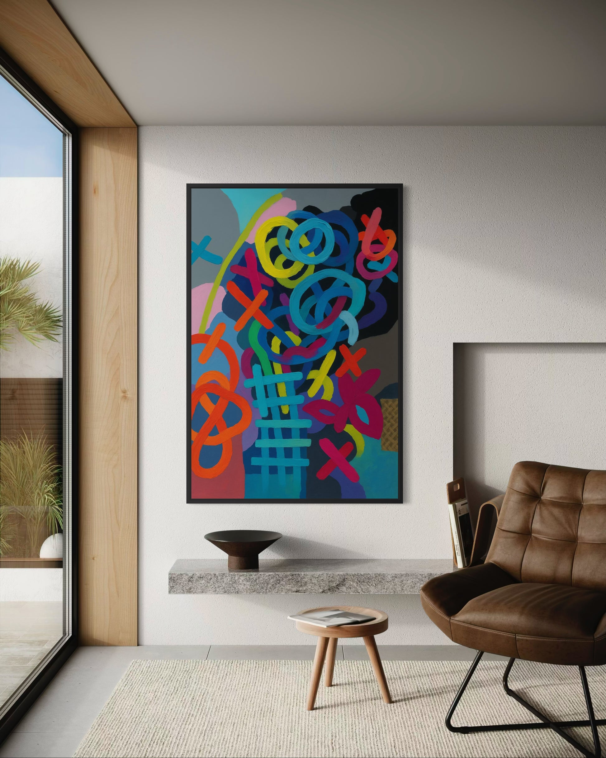 A vibrant abstract composition of looping, crisscrossing strokes in neon hues—overlapping and interlocking in chaotic harmony. This energetic work symbolizes complexity, connection, and playful creative spontaneity.