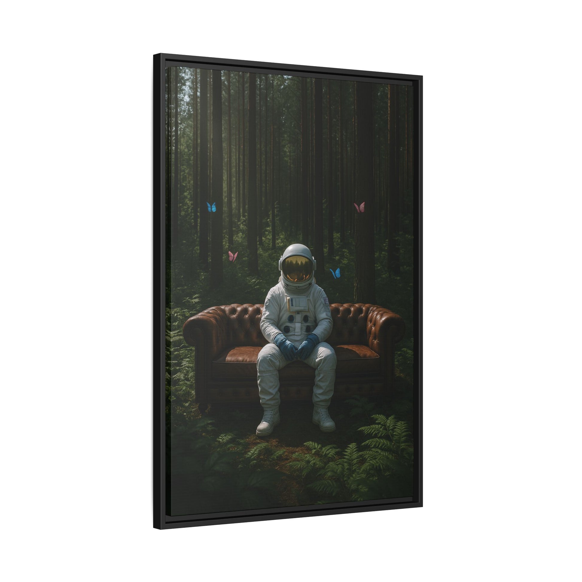 The Stillness Between Worlds captures a serene paradox—an astronaut, emblem of outer exploration, grounded on a vintage leather sofa amidst a lush forest bathed in soft light. Butterflies drift through the air, evoking transformation and the quiet poetry of Earth. This surreal encounter of space and nature offers a moment of reflection, bridging the infinite with the intimate. A visual meditation on presence, solitude, and the wonder found in unexpected places.