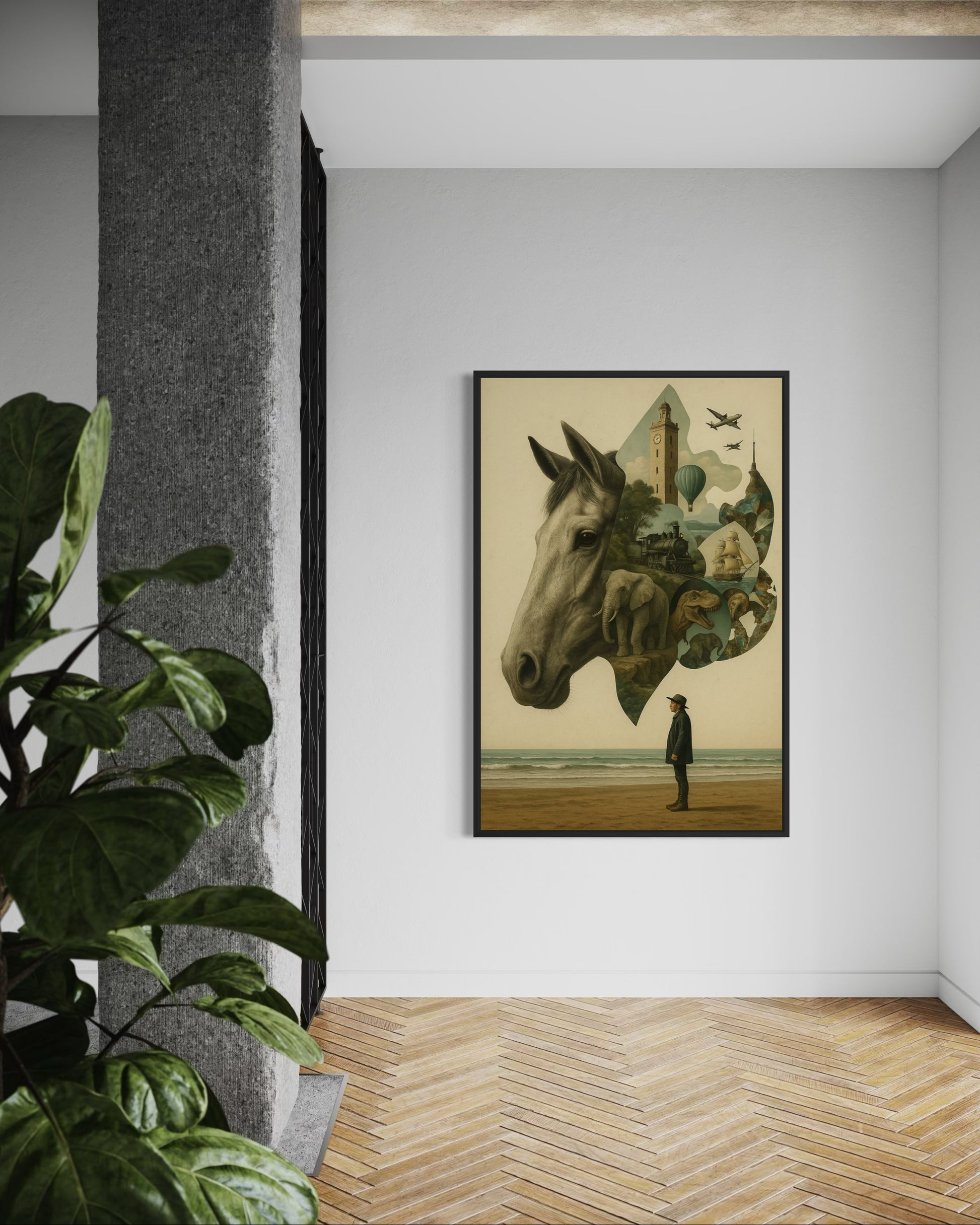 A surreal composition blending a horse’s head with windows into the imagination—revealing a world of historical and natural wonders. From a steam locomotive and tall ships to dinosaurs, elephants, and soaring aircraft, this visual tapestry captures the timeless spirit of exploration. Standing on the shore, a contemplative figure gazes toward this dreamscape, blurring the line between memory, imagination, and discovery. Rendered in soft, vintage tones, the piece evokes a sense of nostalgic wonder and limitless possibility. Perfect for those who believe the greatest journeys begin in the mind.